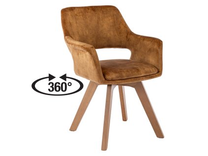 Jídelní židle s textilním potahem ve žlutooranžové barvě a masivními bukovými nohami s lakovaným povrchem. Otočná o 360°. Výška sedu 47 cm, nosnost 120 kg.