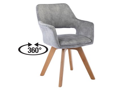 Jídelní židle s textilním potahem ve světle šedé barvě a masivními bukovými nohami s lakovaným povrchem. Otočná o 360°. Výška sedu 47 cm, nosnost 120 kg.