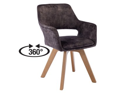 Jídelní židle s antracitovým textilním potahem a masivními bukovými nohami v lakovaném provedení. Otočná o 360°. Výška sedu 47 cm, nosnost 120 kg.