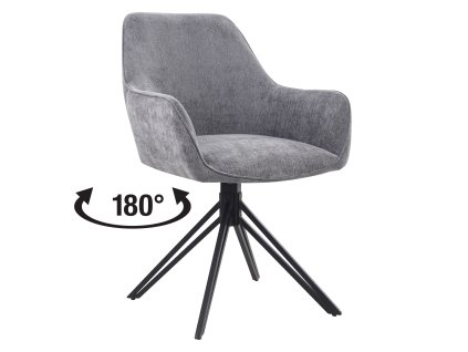 Moderní jídelní židle s textilním potahem v šedé barvě a černou kovovou konstrukcí. Otočná o 180 stupňů, výška sedu 50 cm. Doporučená nosnost do 120 kg.