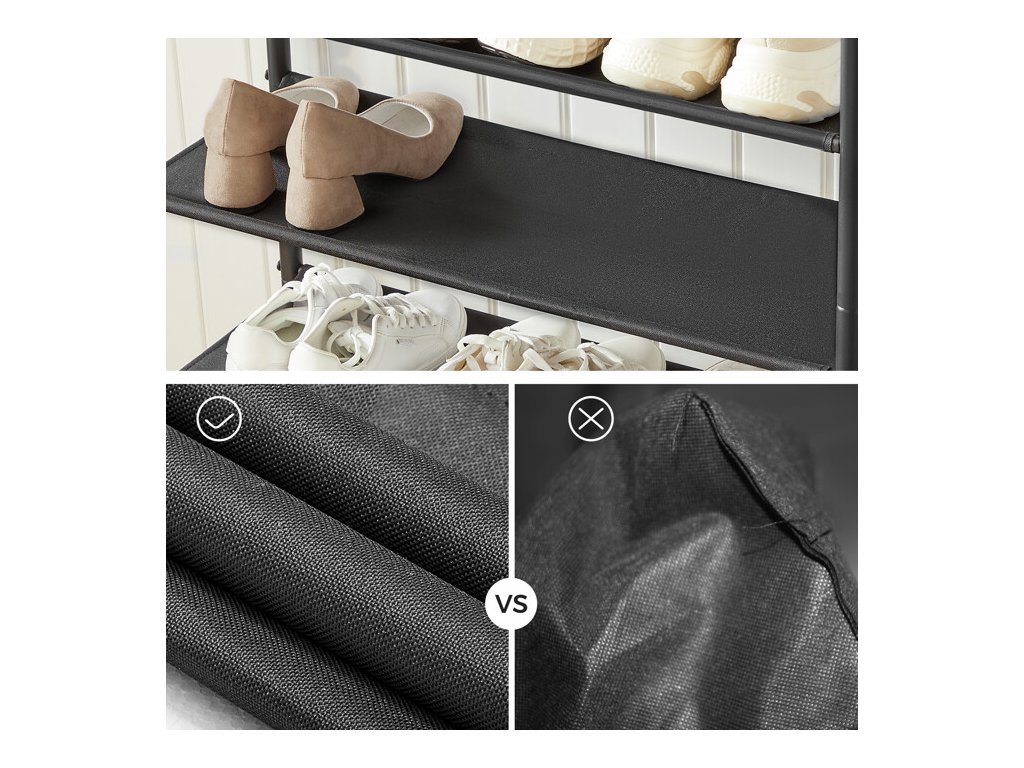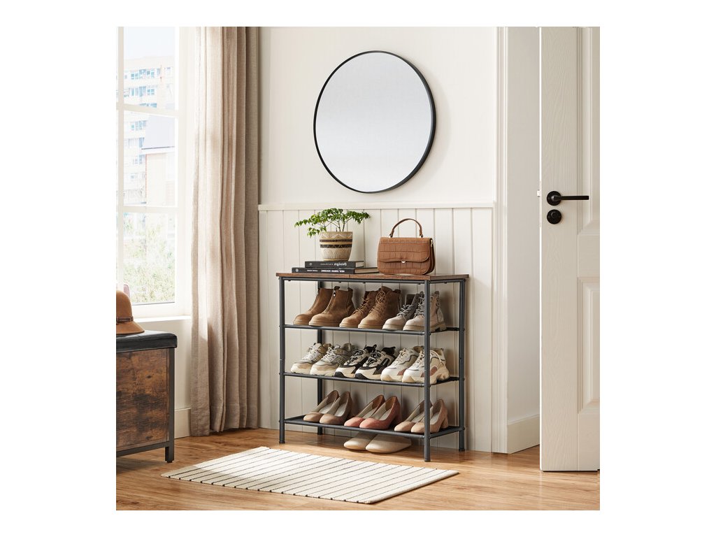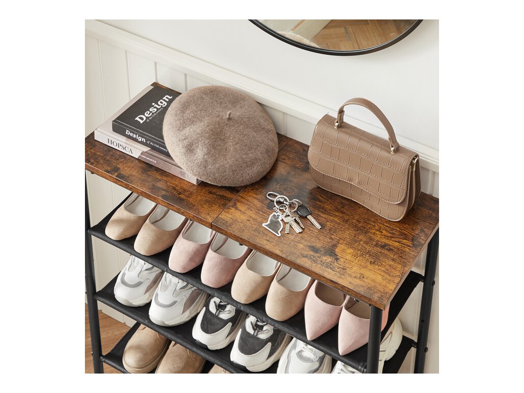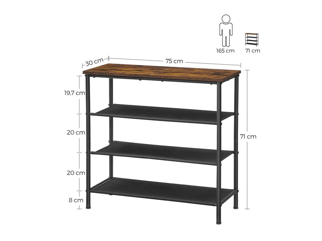 Botník v rustikálním stylu kombinuje desku z MDF s dekorem old wood v hnědém odstínu a pevnou kovovou konstrukci v inkoustově černé barvě. Nabízí tři prostorné police potažené polyesterovou tkaninou, které poskytují dostatek místa pro uložení obuvi i dalších drobných předmětů. Kovové nohy jsou opatřeny plastovými kluzáky, které chrání podlahu před poškozením a zajišťují stabilitu. Kompaktní rozměry 75 × 30 × 71 cm umožňují snadné umístění do předsíně či chodby, kde botník efektivně využívá prostor a zároveň přispívá k příjemné atmosféře díky rustikálnímu vzhledu.