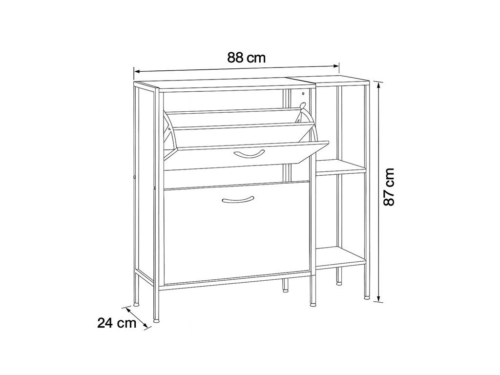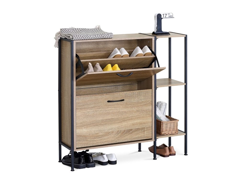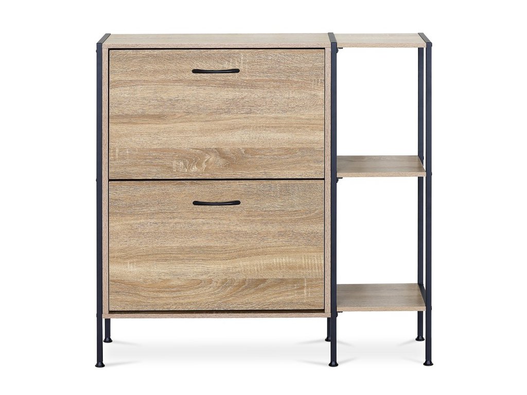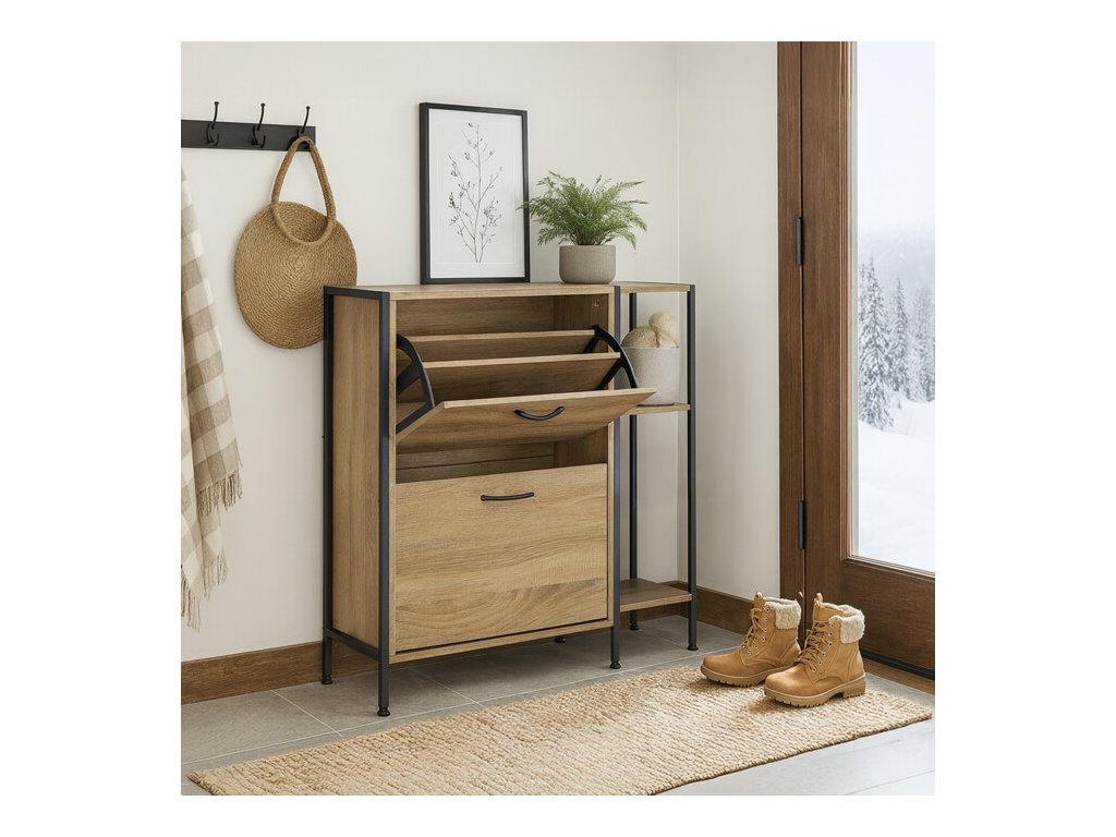 Botník v dekoru dub kombinuje praktické úložné prostory s moderním designem. Je vyroben z MDF desek s povrchovou úpravou v odstínech přírodního dřeva, která je snadno udržovatelná. Nabízí dvě přihrádky s výklopnými dvířky pro uložení obuvi a tři otevřené police na doplňky nebo dekorace. Černé kovové nohy a úchytky dodávají botníku stabilitu a industriální vzhled. Kompaktní rozměry umožňují umístění do předsíní i menších prostor.Doplňkové parametry