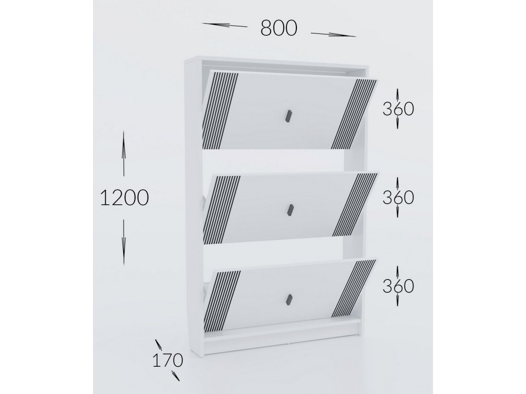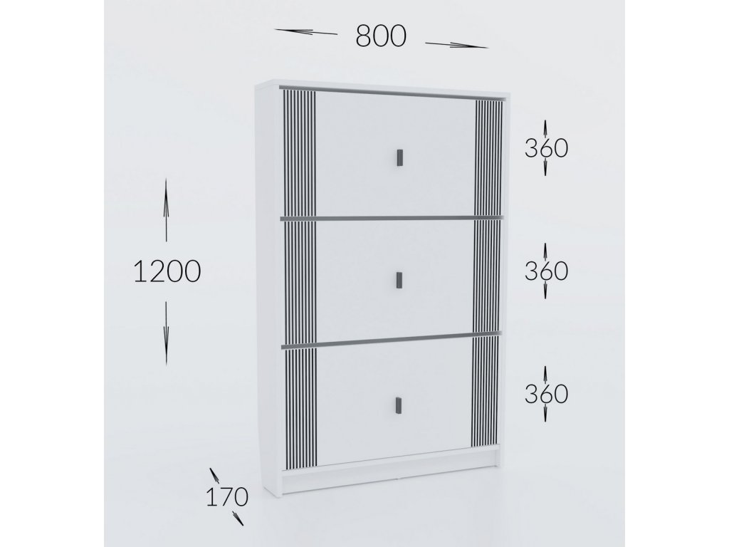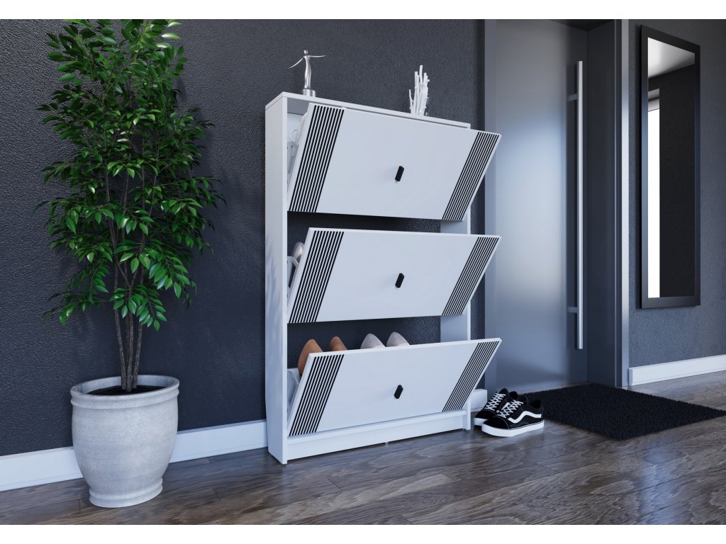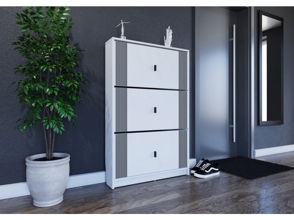 Třídveřový výklopný botník v moderním provedení. Korpus i dvířka jsou z kvalitního LTD v barvě matná bílá s v kombinaci s dekoračními šedými proužkami. Podívejte se na ilustrační video ZDE!. Dodáváme v demontovaném stavu.