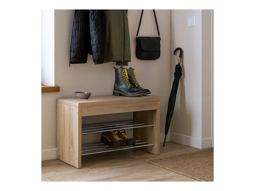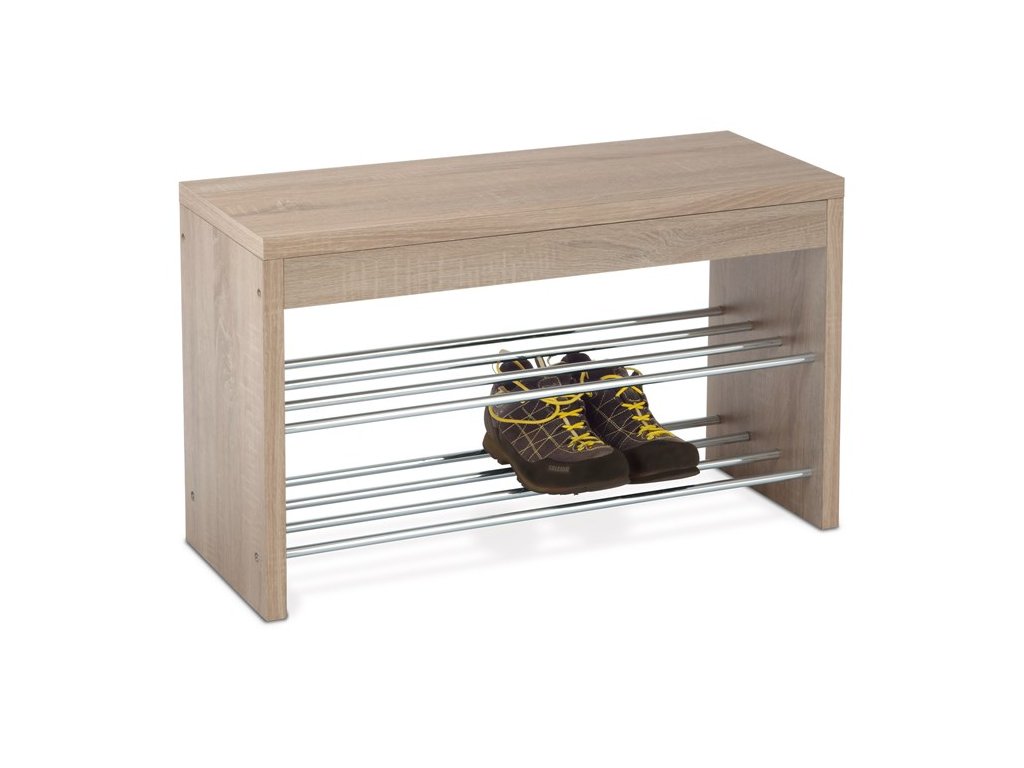 Praktický botník s dvěma kovovými rošty, který zároveň slouží i jako sedací lavice. Díky svým rozměrům má ideální ložnou plochu na uložení bot, ale prostorově se vejde i do menších předsíní. Kostra botníku je z MDF v 3D dekoru dub sonoma. Rošty jsou z kovových chromovaných trubek o průměru 12 mm. Nosnost na sezení je 90 kg, nosnost jednotlivých polic je 6 kg. Dodáváno v demontu.S tímto botníkem bude přezouvání vždy pohodlné a bezpečné.