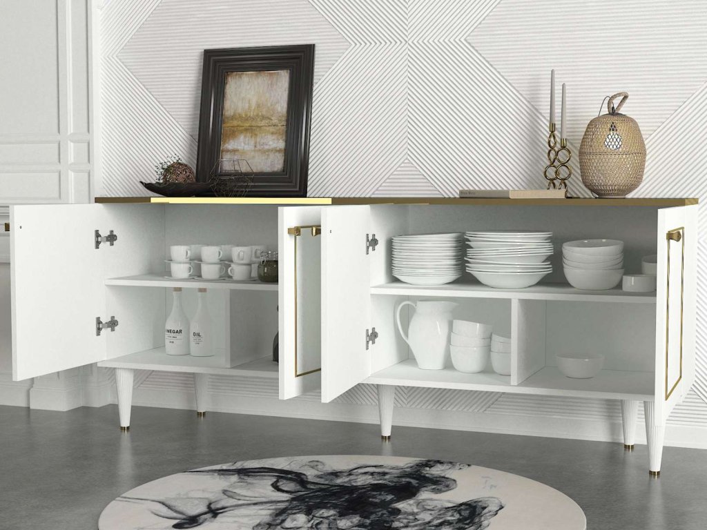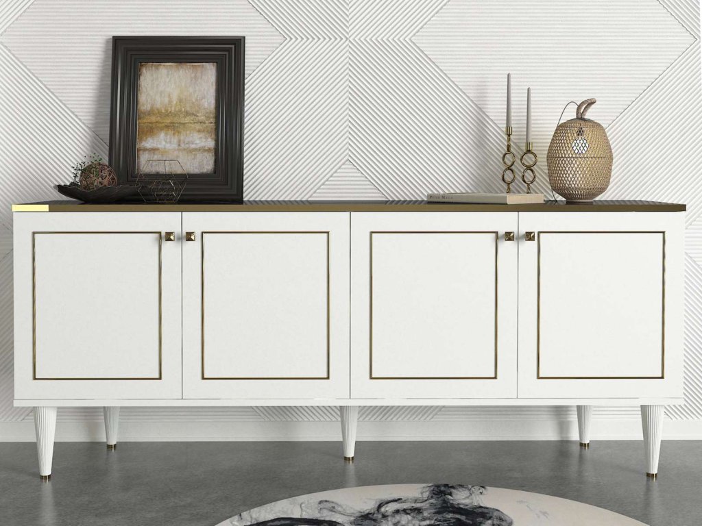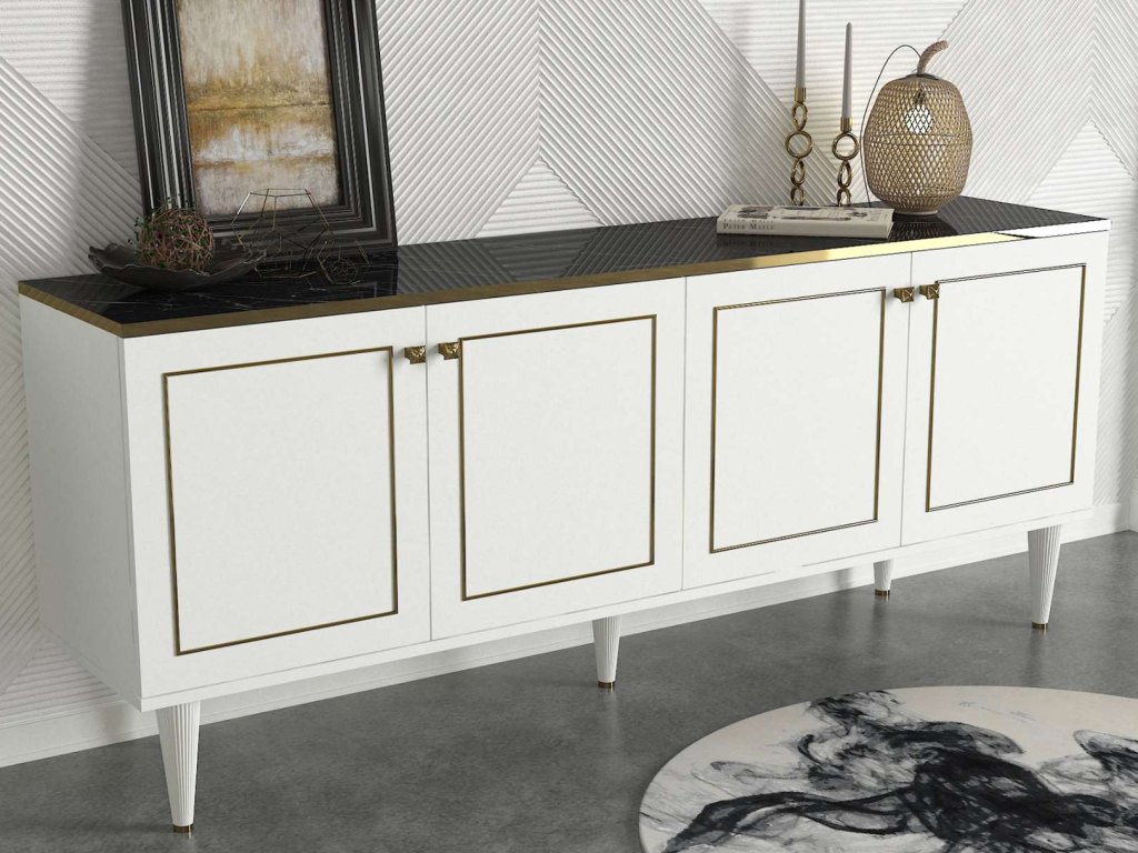 Široká komoda CAMUS je ideální do obývacího pokoje i ložnice. Vyrobena z LTD v dekoru bílá + mramor, se 4 dvířky pro praktické ukládání.- Rozměry: 180 × 76 × 40 cm
