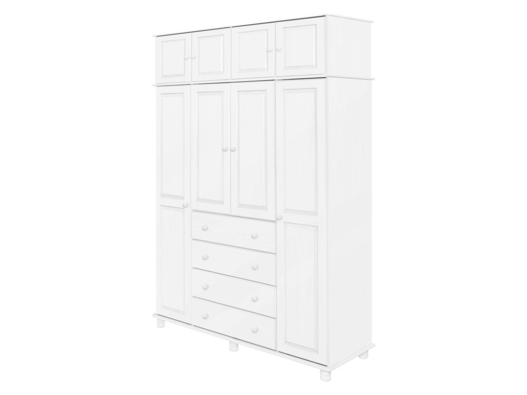 materiál masiv borovice, barevné provedení bílý lak ,čtyři široké zásuvky s kovovými pojezdy ,v levé části dvě šatní tyče, ve střední části 1 police a v pravé části 3 policedoporučený nástavec 8853B