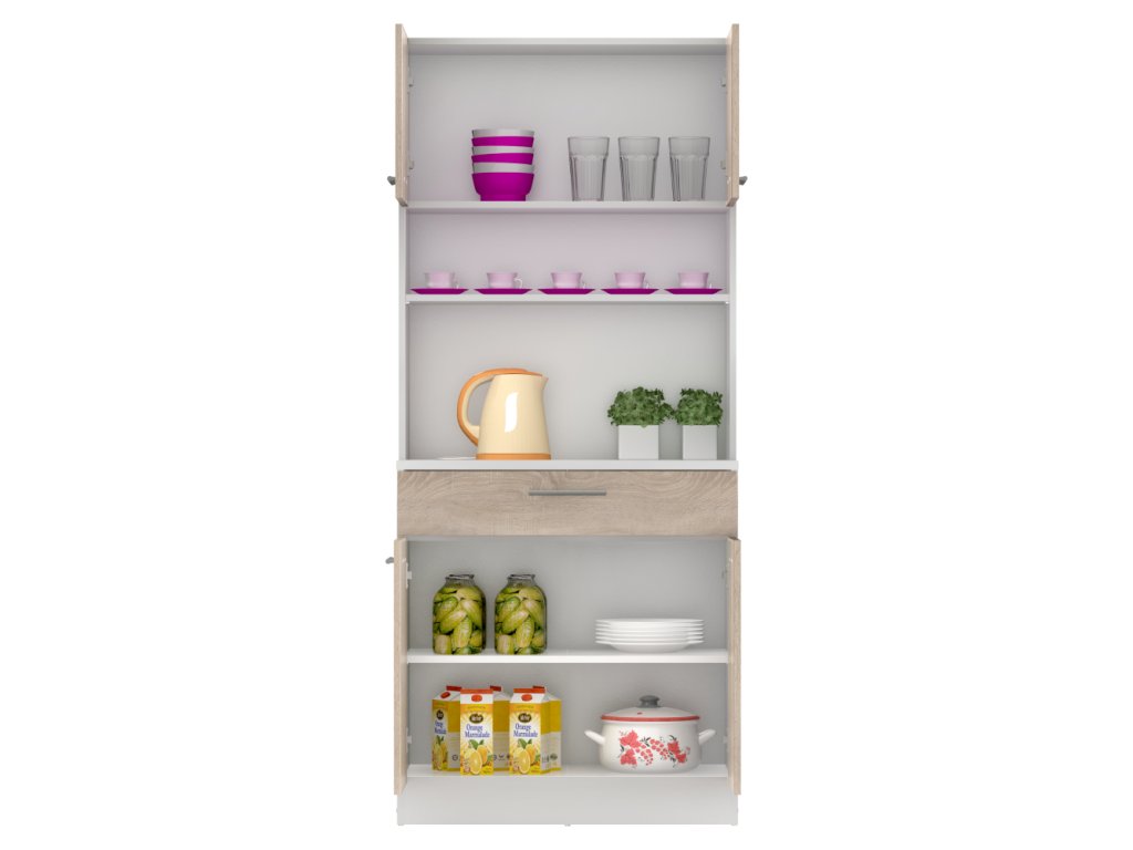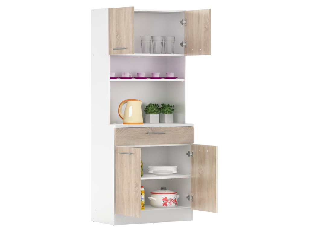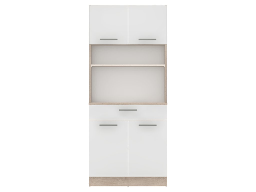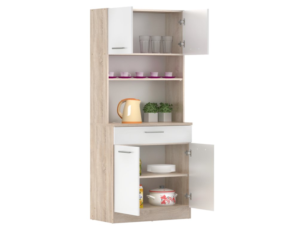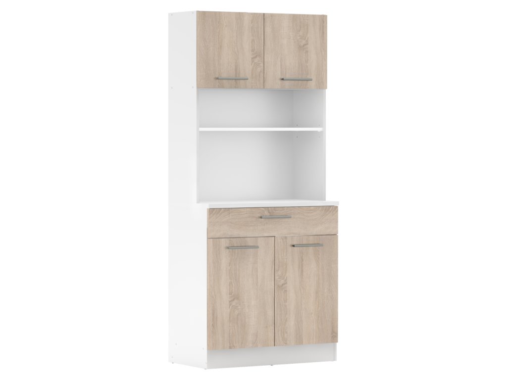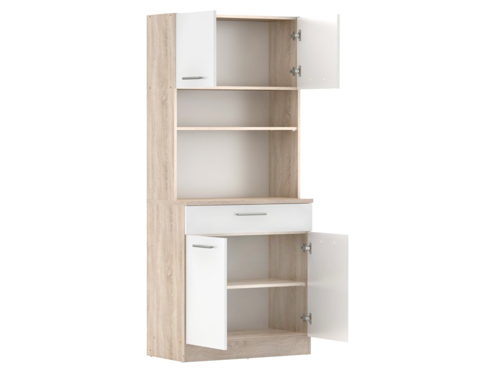 Čtyřdveřový kredenc v dekoru dub sonoma/bílá je praktický a víceúčelový kus nábytku.Klíčové vlastnosti: