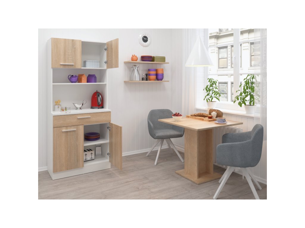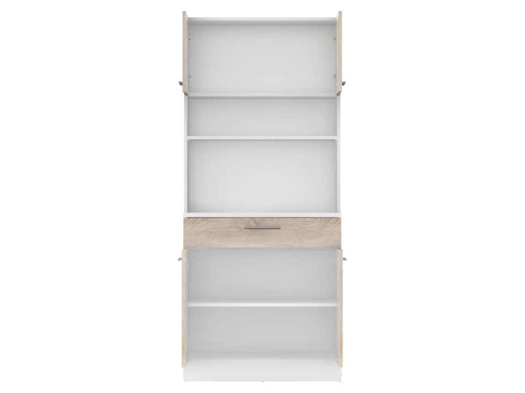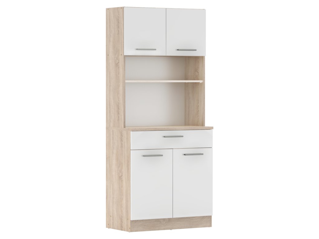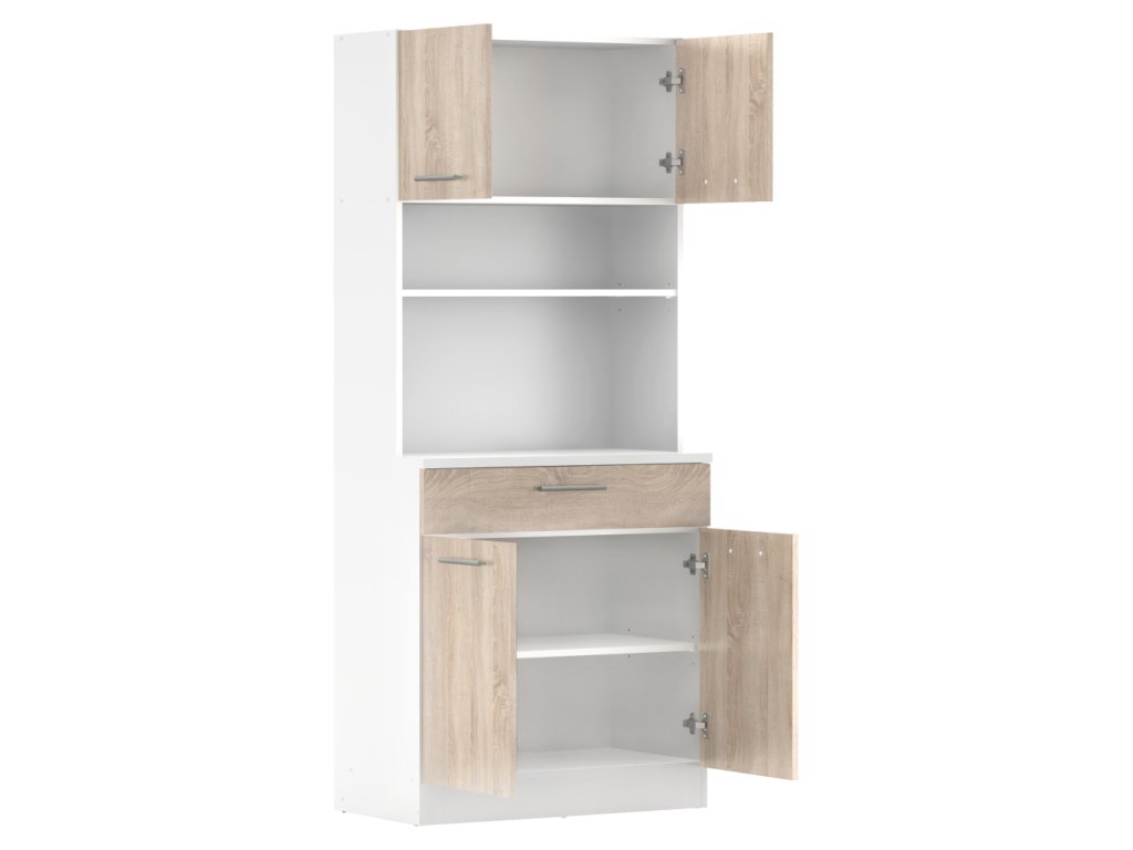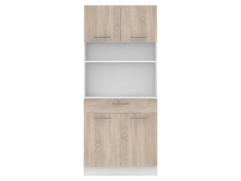 Čtyřdveřový kredenc v dekoru dub sonoma/bílá je praktický a víceúčelový kus nábytku.Klíčové vlastnosti: