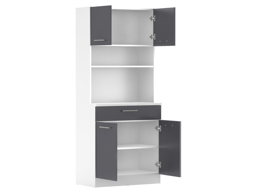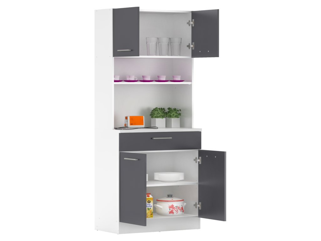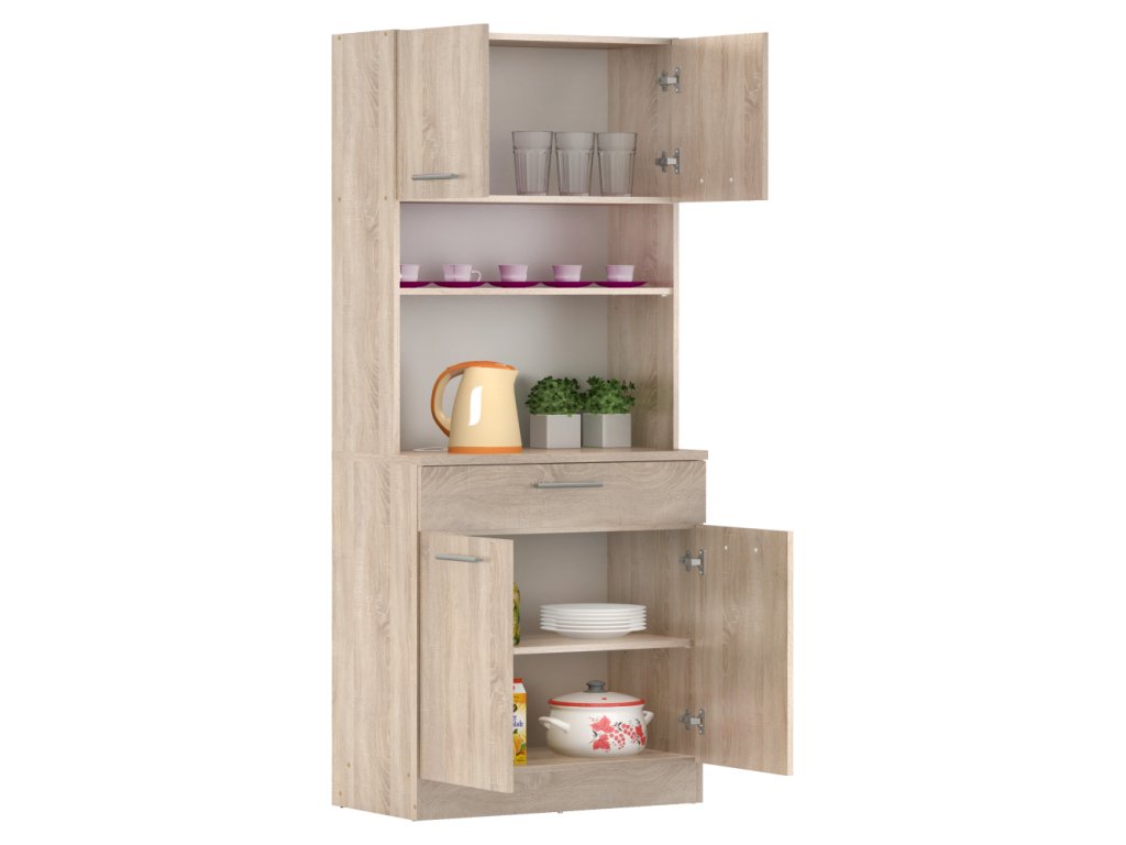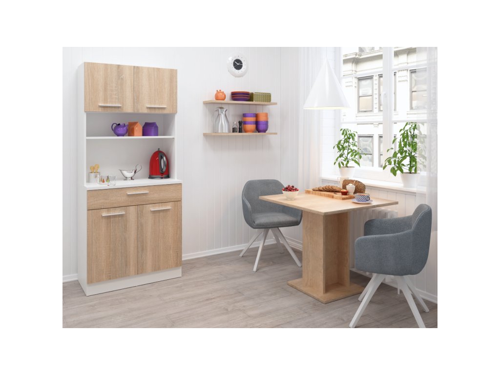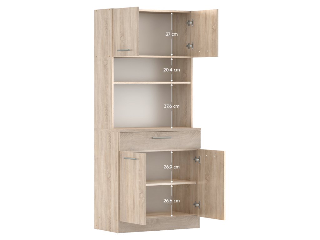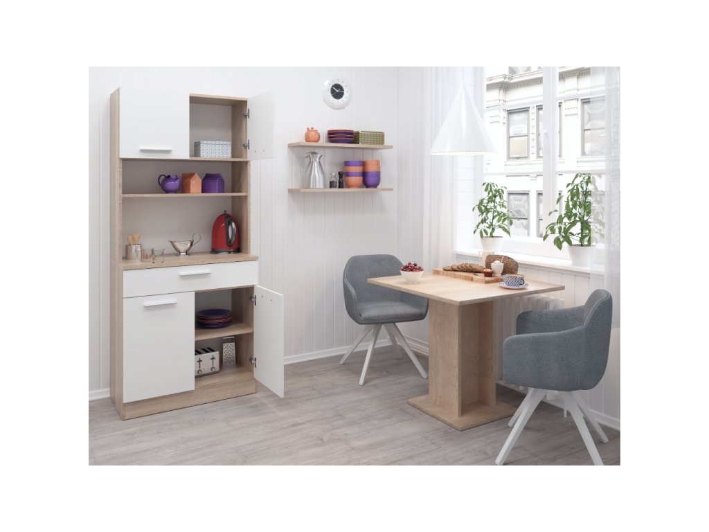 Čtyřdveřový kredenc v dekoru dub sonoma/bílá je praktický a víceúčelový kus nábytku.Klíčové vlastnosti: