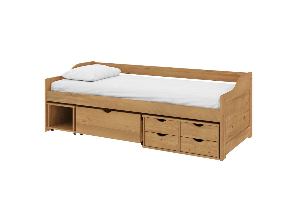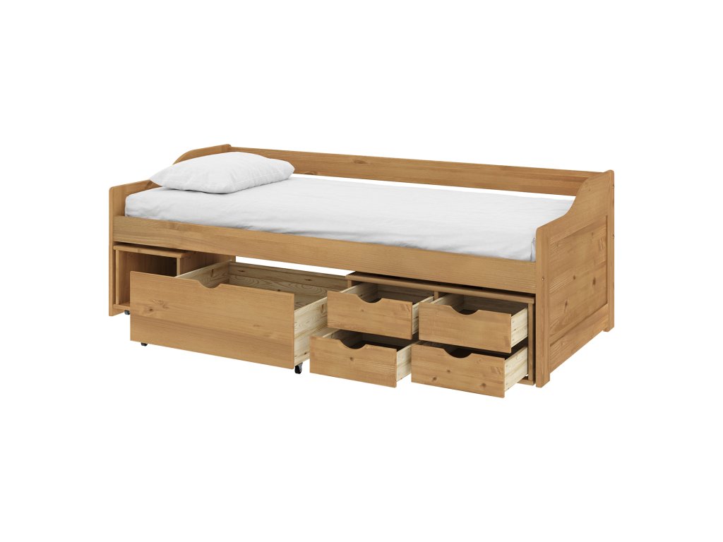 materiál masiv borovice voskovaná, cena včetně roštu (dřevěný laťkový), matrace není v ceně, doporučený rozměr matrace 90 × 200 cm (M2, M5, M9, M12, M14, M24, M26) praktické úložné prostory pod postelí (5 zásuvek) v ceněDoplňkové parametry