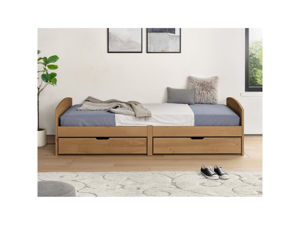 Jednolůžko se zásuvkami 8818V MARIA – voskované provedeníKlasické jednolůžko z masivní borovice v přírodním voskovaném provedení přinese do vaší ložnice teplo a útulnost. Postel je vybavena dvěma prostornými zásuvkami na kolečkách, které poskytují praktický úložný prostor pro lůžkoviny, oblečení nebo hračky. Díky dřevěnému laťkovému roštu (součást balení) nabízí pohodlné a pevné spaní.