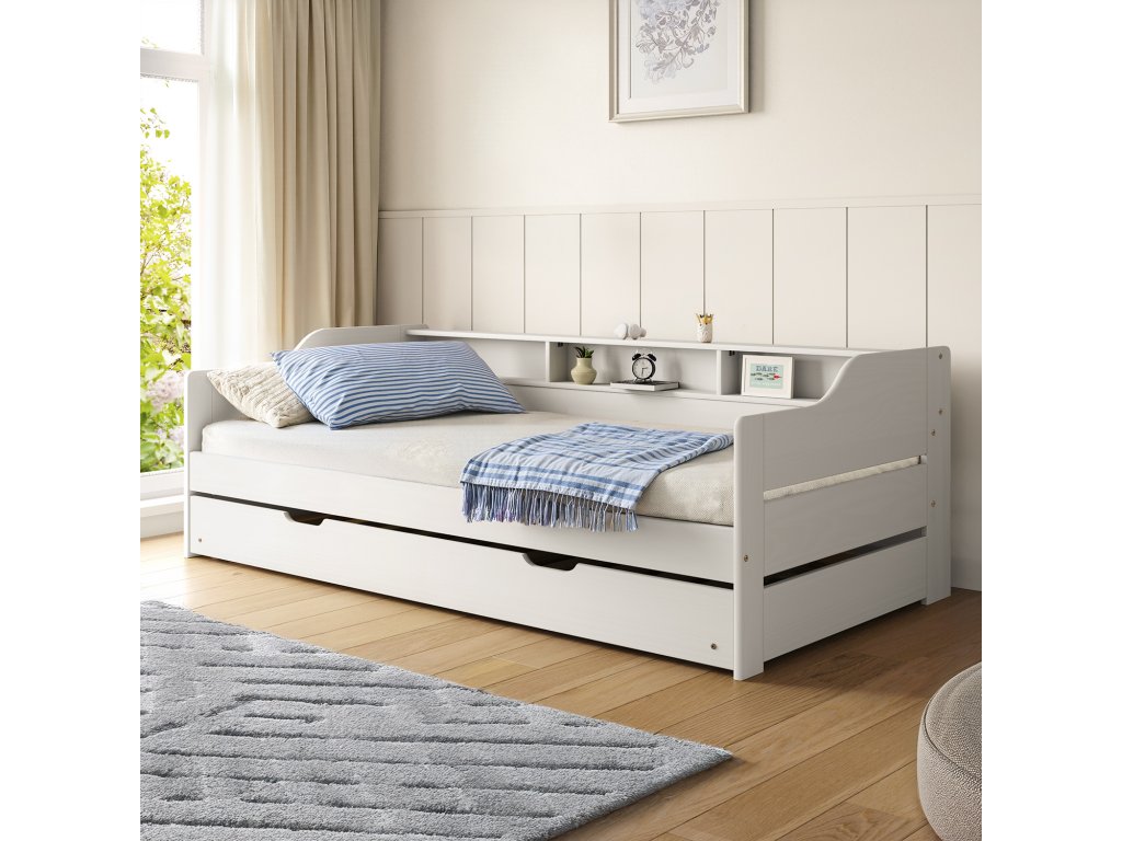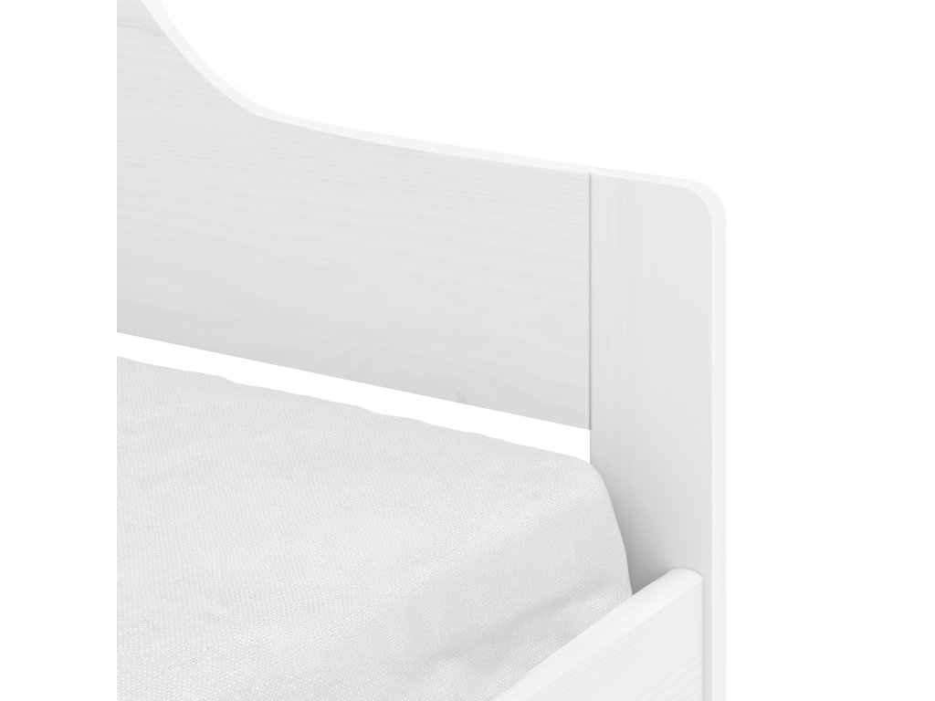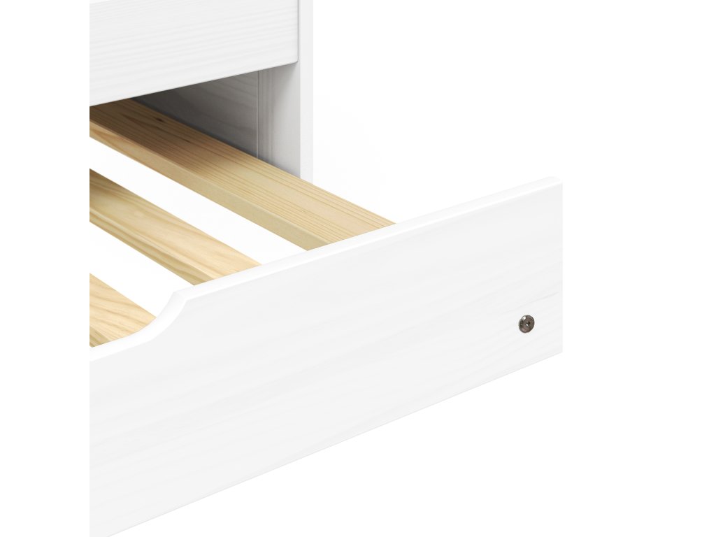 Praktické a stylové jednolůžko LILI v bíle lakovaném provedení je vyrobené z masivní borovice. V zadní části najdete otevřenou polici pro odkládání knih či dekorací a v dolní části výsuvnou přistýlku, která je ideální pro hosty nebo sourozence. Postel je dodávána včetně dvou dřevěných laťkových roštů. Matrace nejsou součástí balení – doporučený rozměr pro obě lůžka je 90 × 200 cm.Specifikace:
