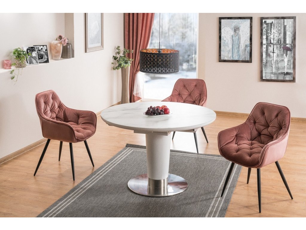 Atraktivní čalouněná židle - křeslo vhodná nejen do Vaší jídelny a kuchyně, ale také do kanceláře, čekárny či recepce. Konstrukce je z kovu černé barvy. Čalounění židle je z potahové látky aksamit (BLUVEL 52) ve starorůžové barvě. Dodáváme v demontovaném stavu.Doplňkové parametry