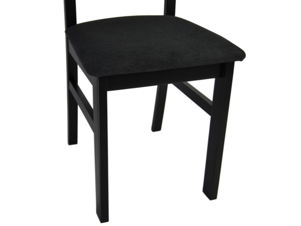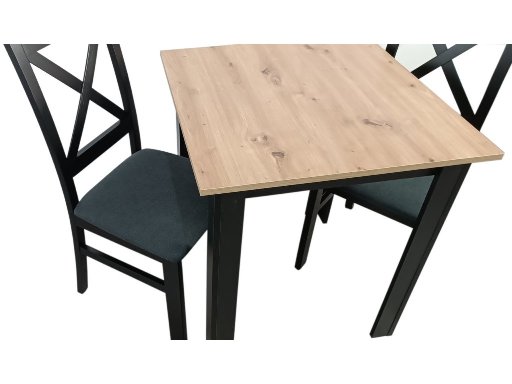 Jídelní sestava 1 stolu a 2 židlí. Deska jídelního stolu je vyrobena z LTD v barvě dub artisan, nohy stolu jsou z materiálu MDF a konstrukce židlí z bukového dřeva, obojí v barvě černá mat, vše hraněné ABS páskou. Židle má čalouněný sedák v látce Moric 8 (černá), výplň sedáku PUR pěna T30. Dodáváme v demontovaném stavu.Doplňkové parametry