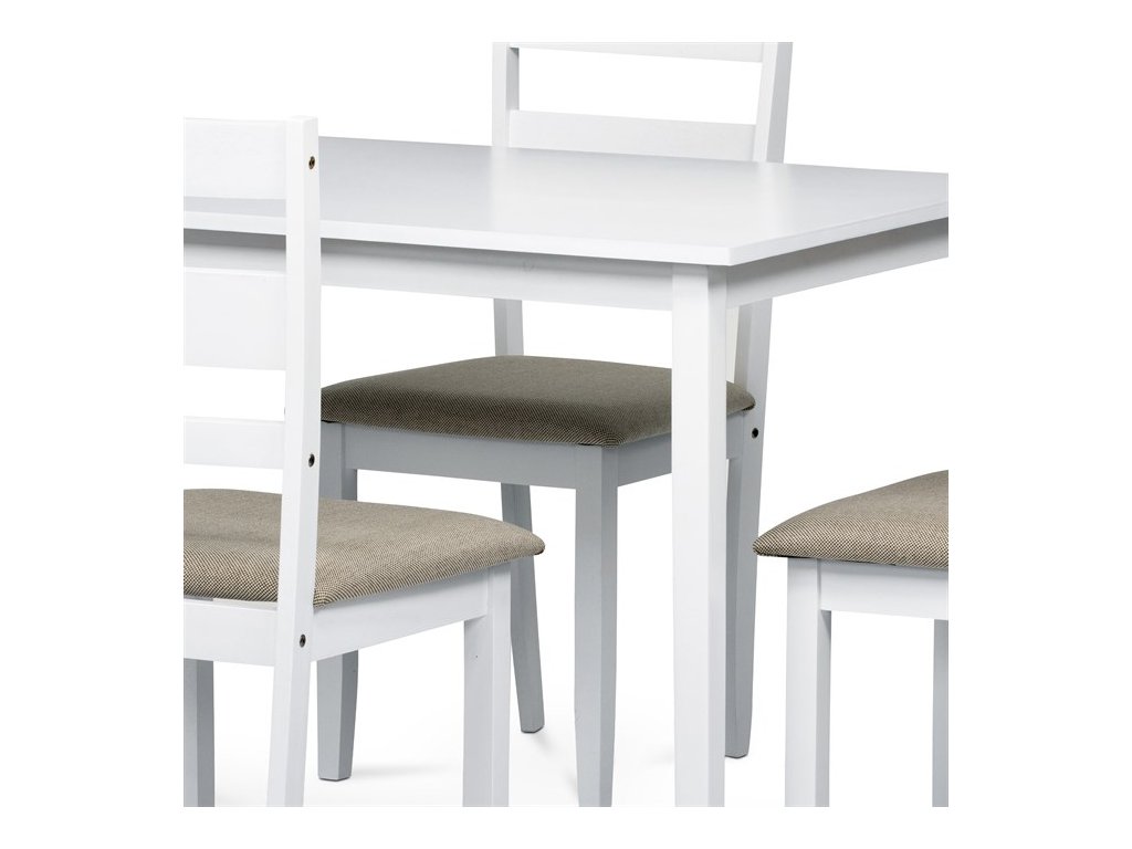 Jídelní set ve stylu landhaus v minimalistickém provedení. Je složen z jídelního stolu a čtyř jídelních židlí.Stůl je o rozměru 120 x 75 x 75 cm. Deska je vyrobena z kvalitní a pevné MDF. Nohy jsou z masivního kaučukovníku. Celý stůl je v bílém matném odstínu. Použitý materiál zajišťuje dostatečnou pevnost i stabilitu celého stolu. Nohy jsou opatřeny plastovými kluzáky, zamezujícími riziko poškození podlahy.