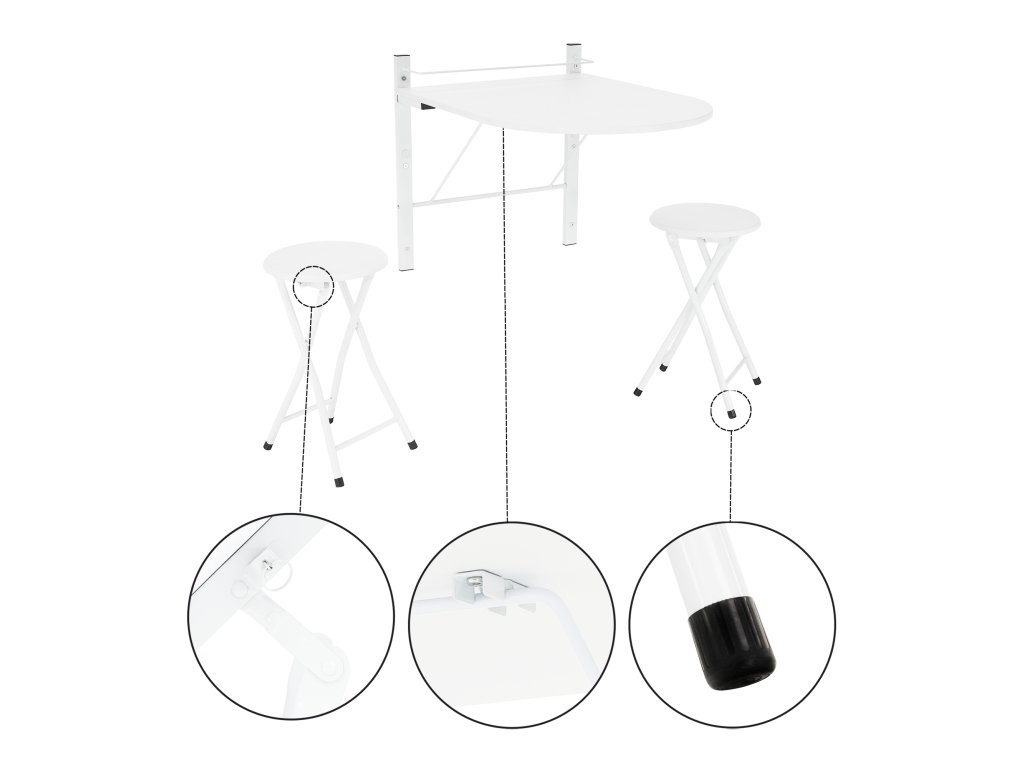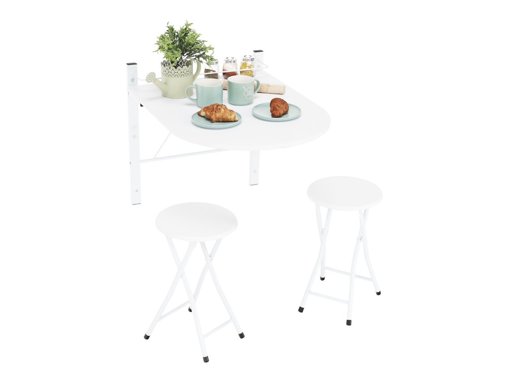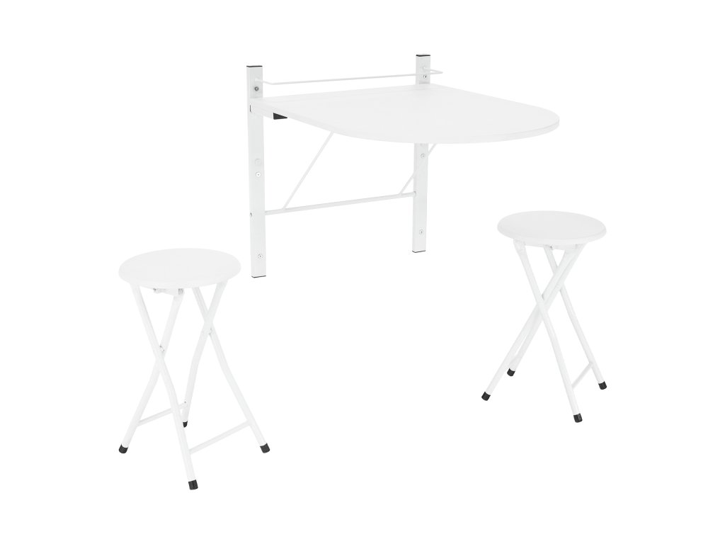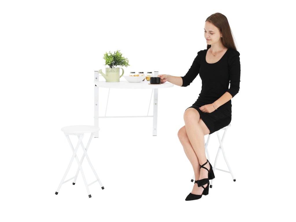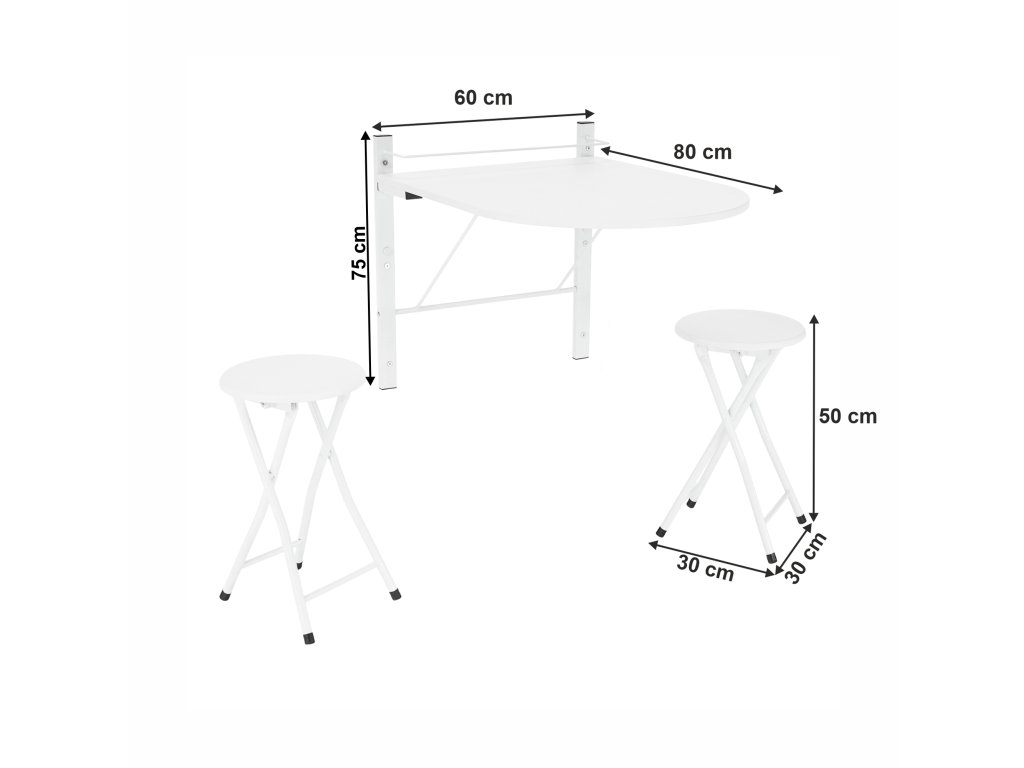 Praktický jídelní set skvělý do menších prostor. Obsahuje jeden stůl a dvě židle - taburety. Materiál: MDF + kov, provedení: bílá, rozměry ŠxHxV: stůl: 60x80x75 cm, židle: 30x30x50 cm.Nosnost židle: 80 kg