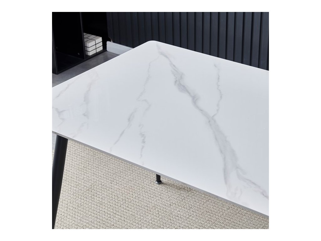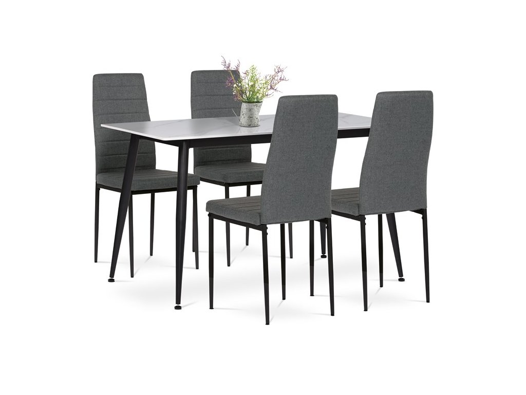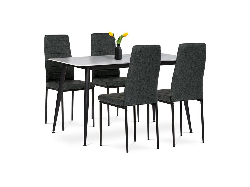 Jídelní set ASE-1004 od značky Autronic přináší moderní industriální styl do každé jídelny. Stůl s obdélníkovou deskou ze slinuté keramiky v bílém mramorovém dekoru je odolný proti poškrábání a doplněný černými kovovými nohami v kónickém tvaru. Pohodlné židle s ergonomicky tvarovanou opěrkou a hladkým černým čalouněním dokonale ladí se stolem. Set je ideální pro ty, kdo hledají stylové a funkční řešení pro každodenní stolování.Doplňkové parametry