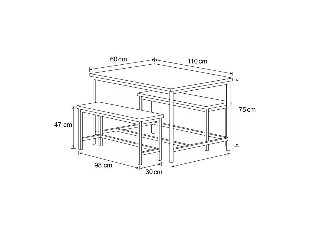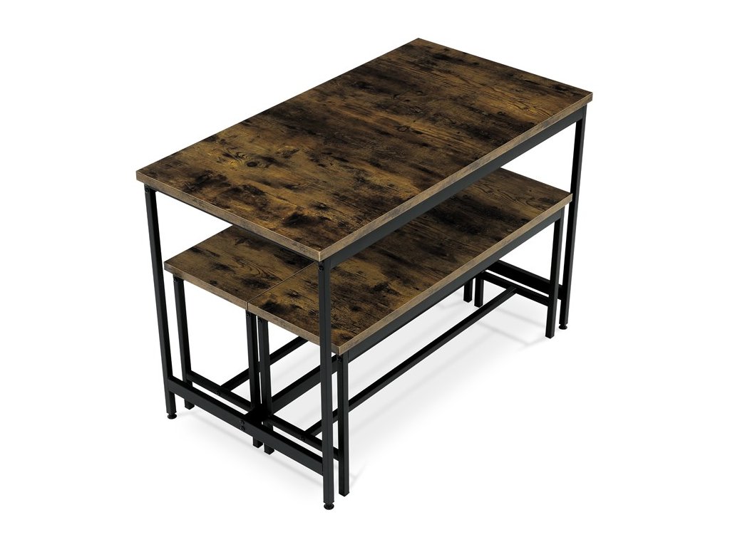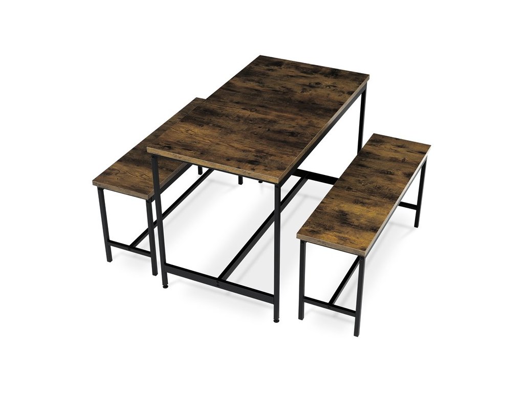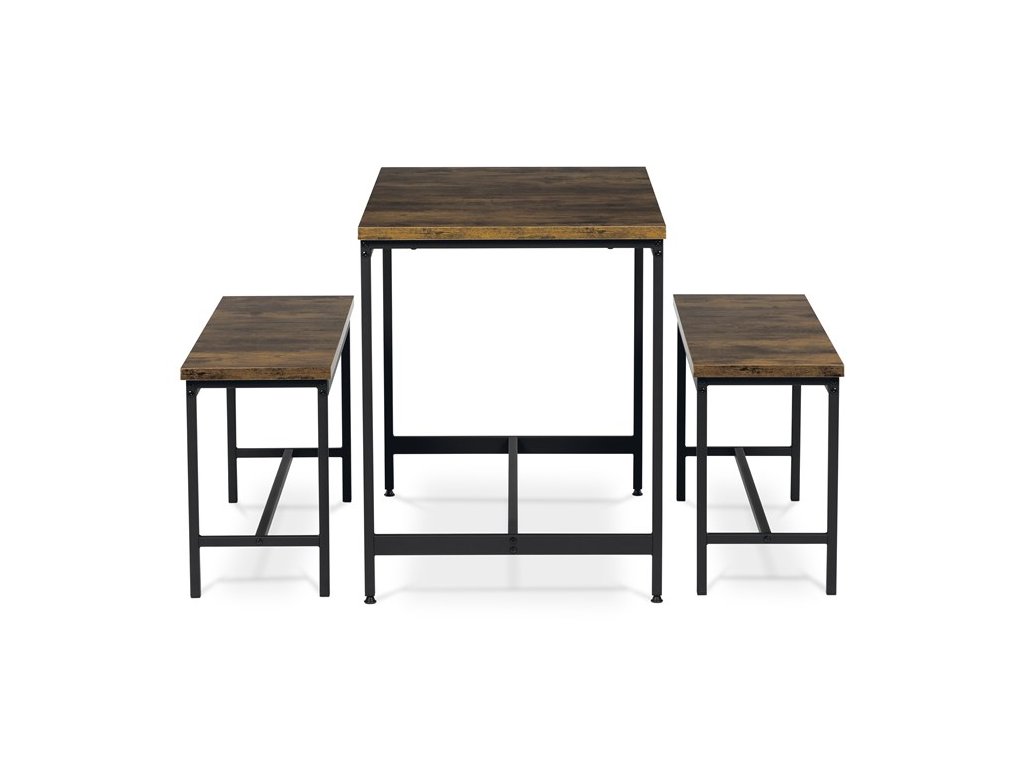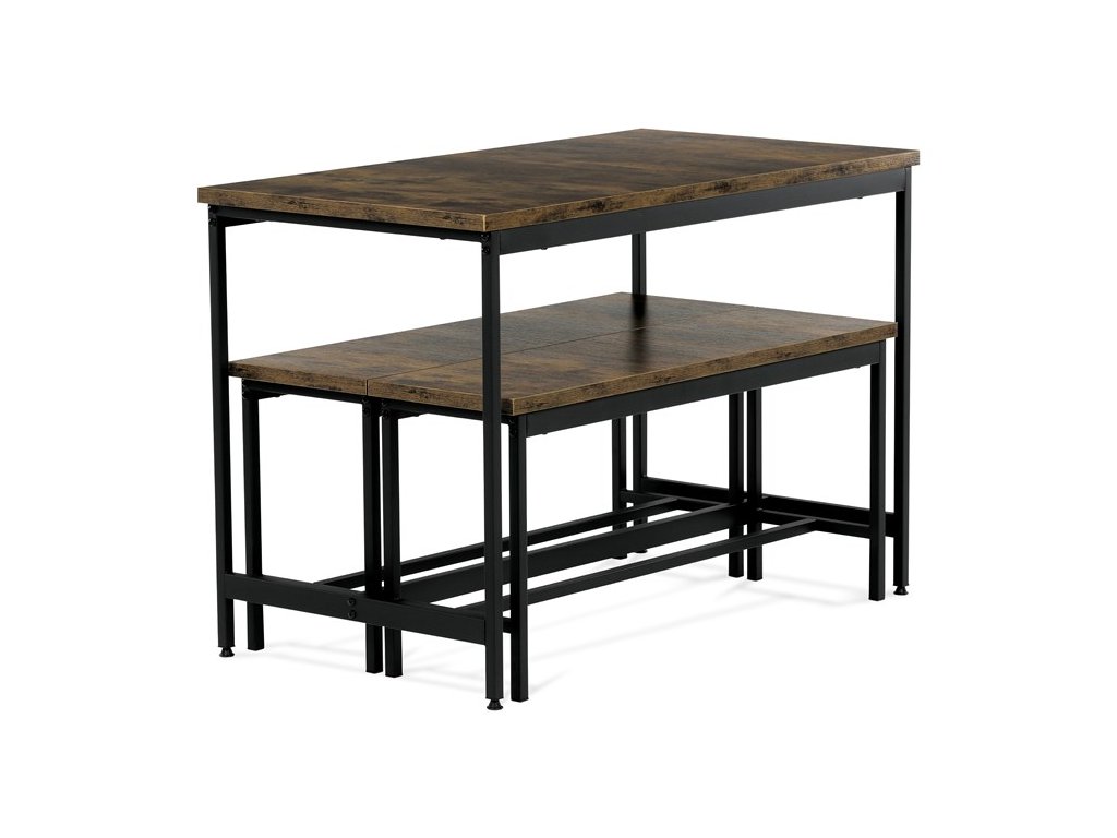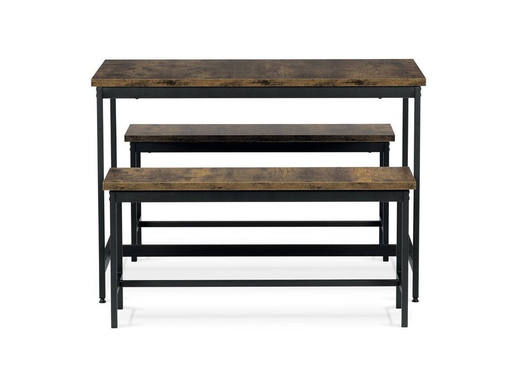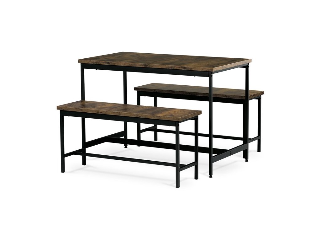 Jídelní set AUT-G1175 – stůl + 2 lavice, industriální stylPraktický jídelní set značky Autronic v industriálním stylu je ideální volbou do moderní kuchyně či jídelny. Sestava obsahuje obdélníkový stůl a dvě lavice, které lze po použití jednoduše zasunout pod stůl a ušetřit tak místo. Desky v dekoru starého dřeva vytvářejí hřejivou, přirozenou atmosféru, zatímco černé kovové nohy poskytují stabilitu a dodávají setu moderní industriální vzhled. Skvělá volba pro malé i větší prostory.