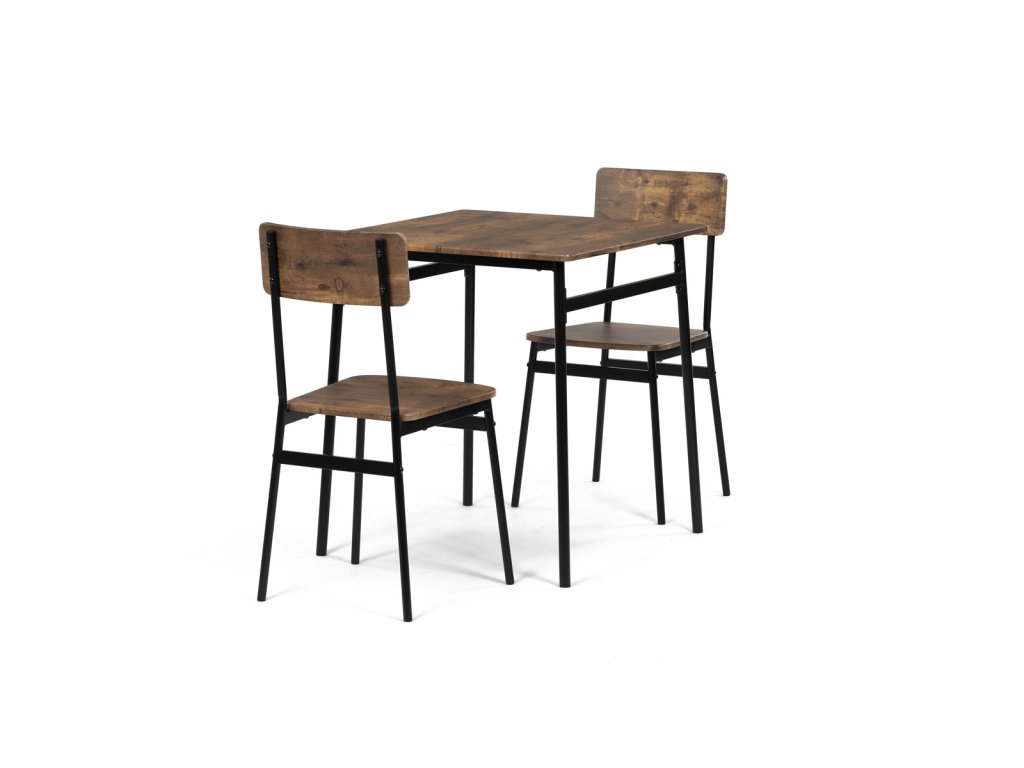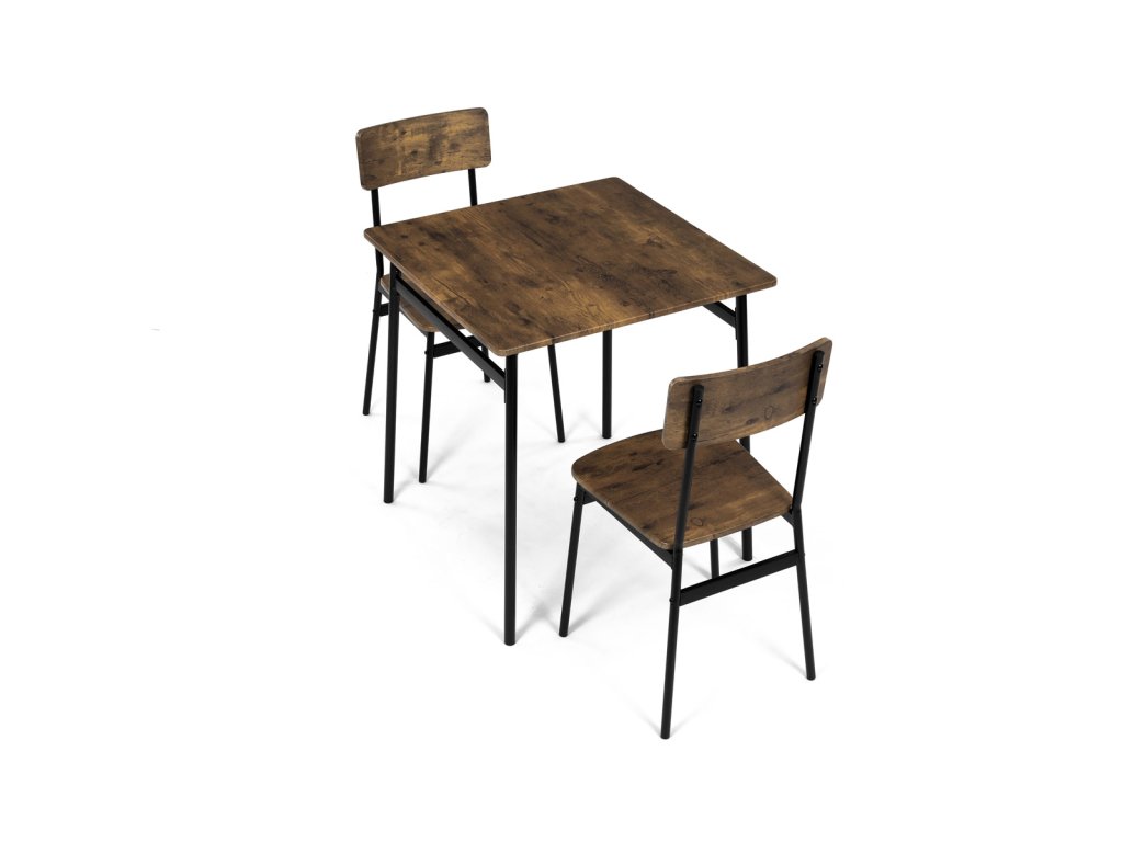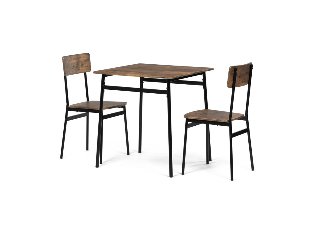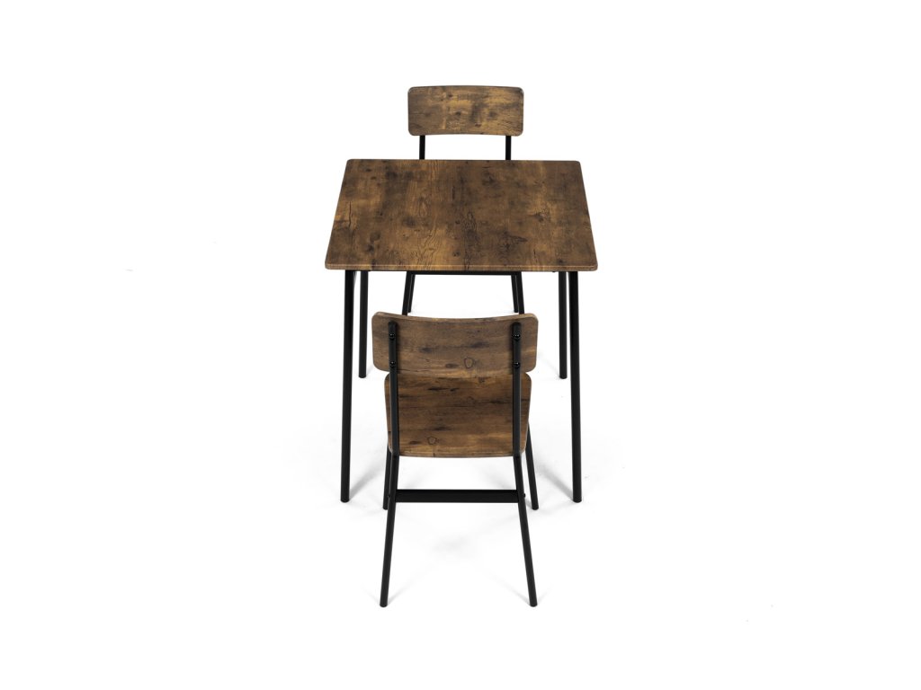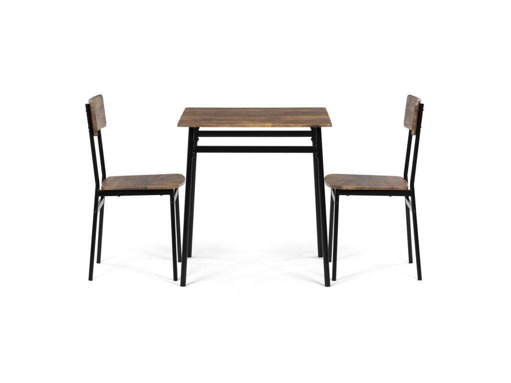 Tento jídelní set značky Autronic je ideální volbou pro menší prostory. Set obsahuje čtvercový stůl a dvě židle, které se svým industriálním designem dokonale hodí do moderních interiérů. Deska stolu i sedáky jsou vyrobeny z odolného MDF s dekorem divokého dubu. Černé kovové nohy dodávají sestavě stabilitu a moderní kontrast. Tento set je ideální pro dvě osoby a je vhodný zejména do menších jídelen nebo kuchyní. Montáž je snadná a rychlá, ideální řešení pro moderní bydlení.Doplňkové parametry