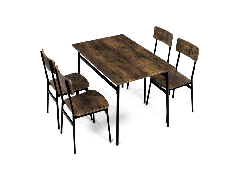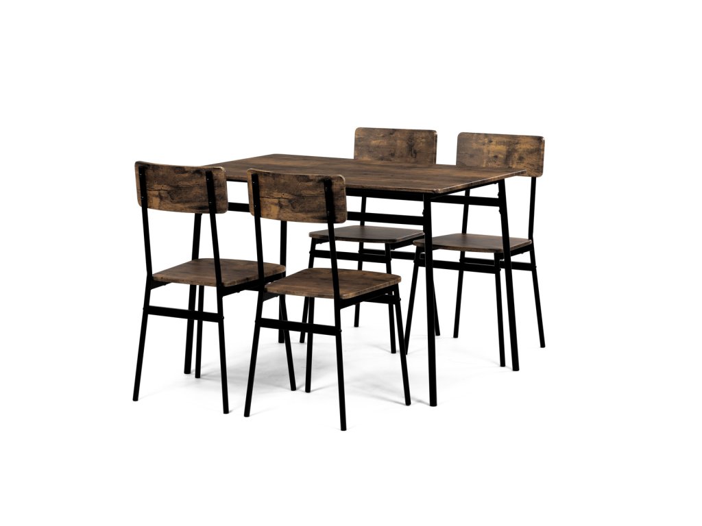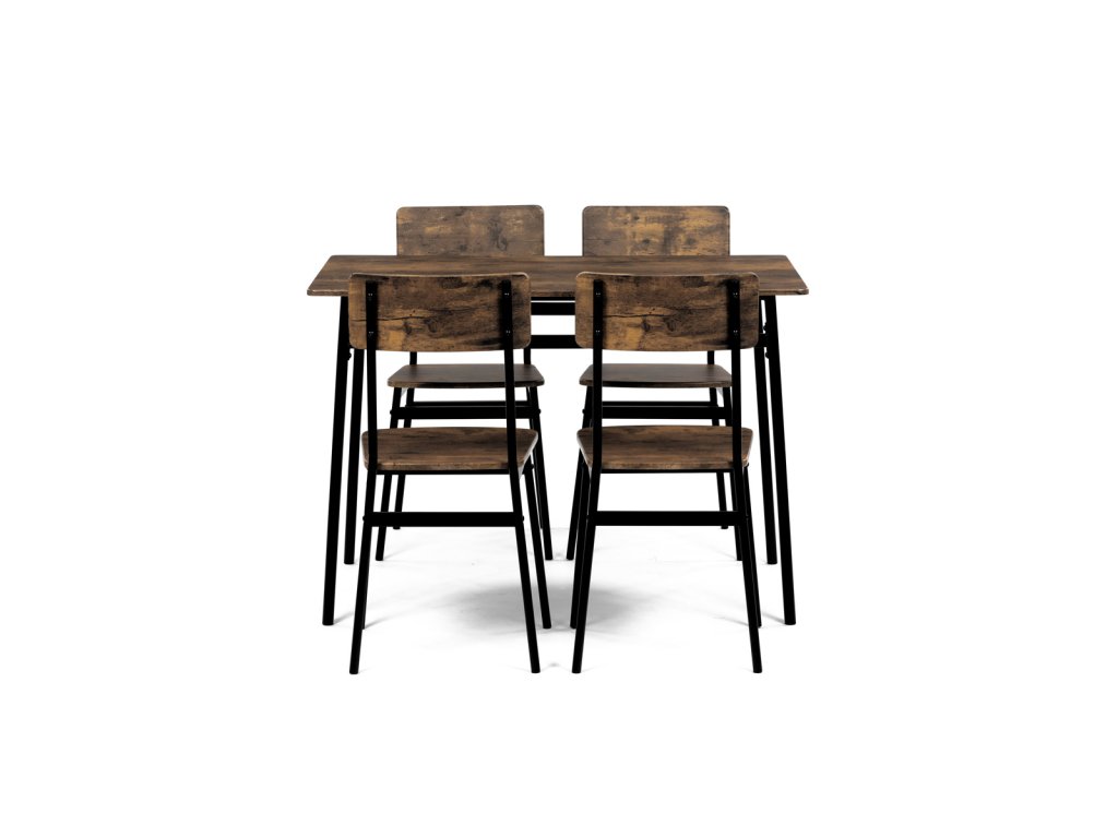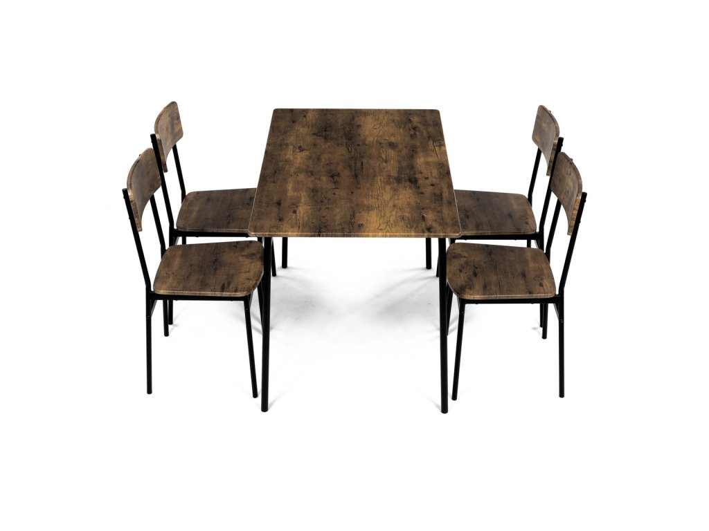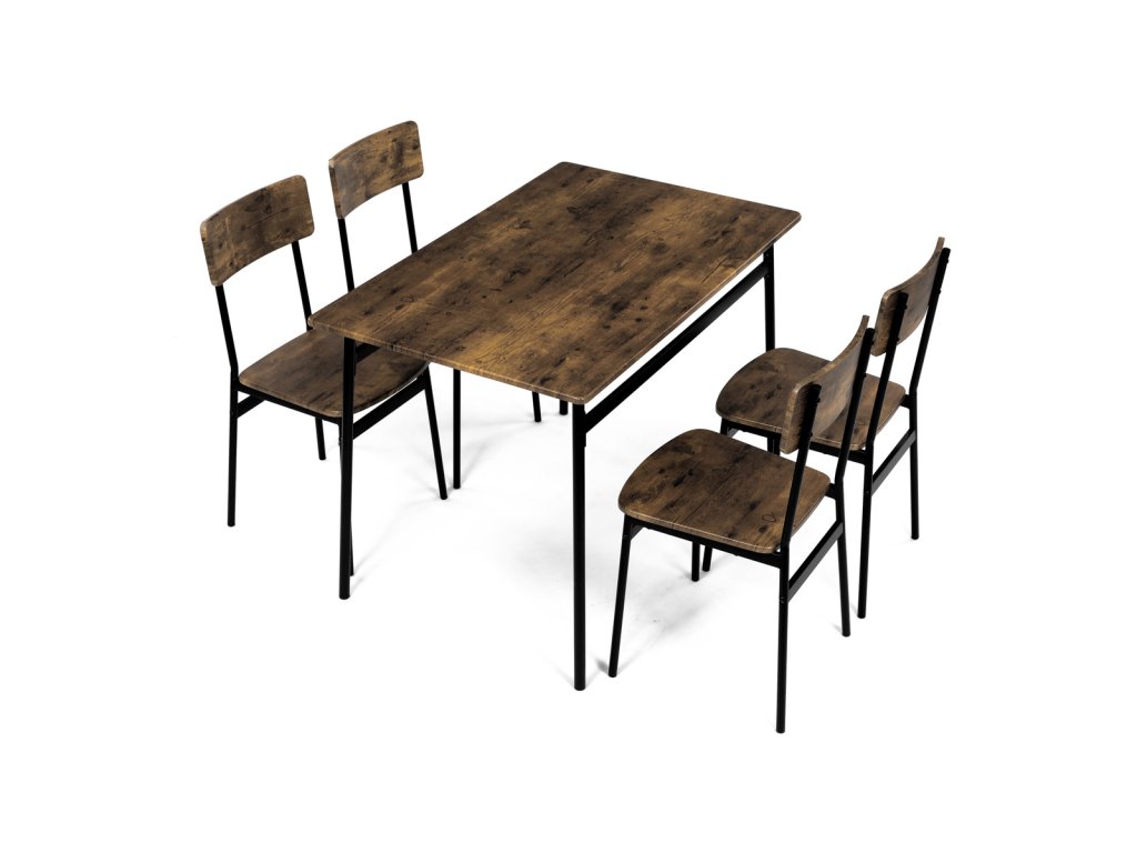 Jídelní set od značky Autronic v industriálním stylu je ideální volbou pro moderní interiéry. Sestava obsahuje stůl a čtyři židle s černýma kovovými nohama, které vytvářejí zajímavý kontrast s prkny v dekoru divokého dubu. Stůl i židle jsou vyrobeny z kvalitního MDF, které zaručuje vysokou odolnost a stabilitu. Tento set je navržen pro pohodlné stolování čtyř osob a perfektně se hodí do jídelny. Díky svému minimalistickému designu a přírodním tónům snadno zapadne do každého moderního domova.Doplňkové parametry