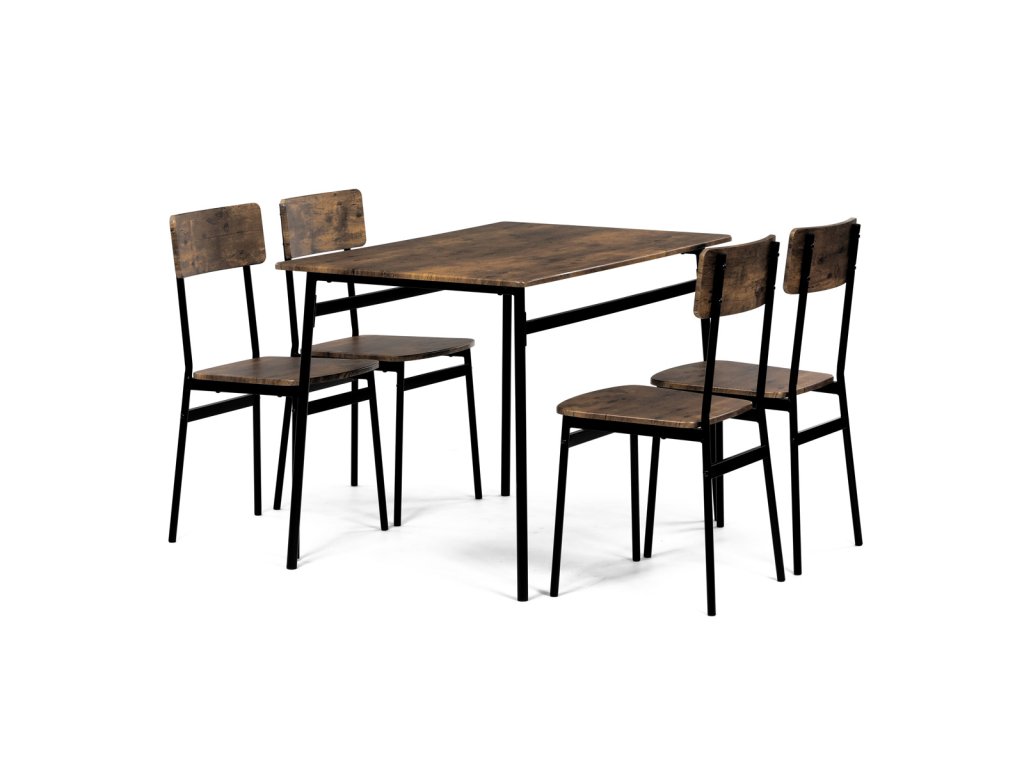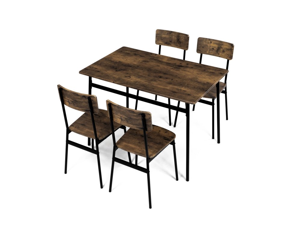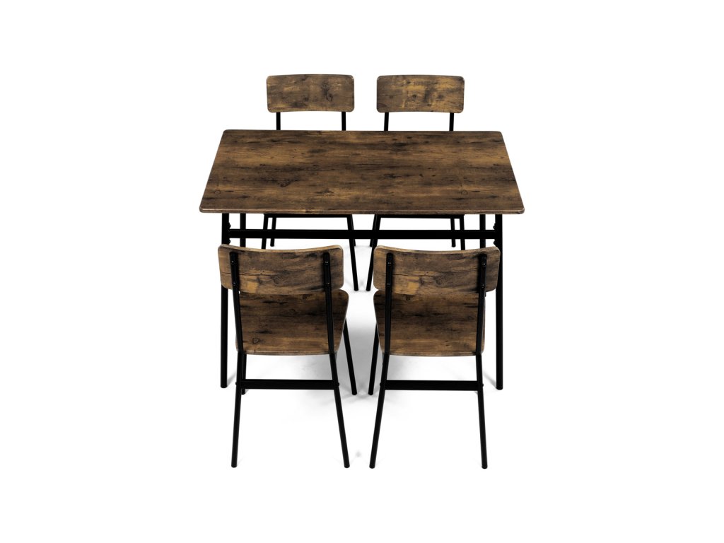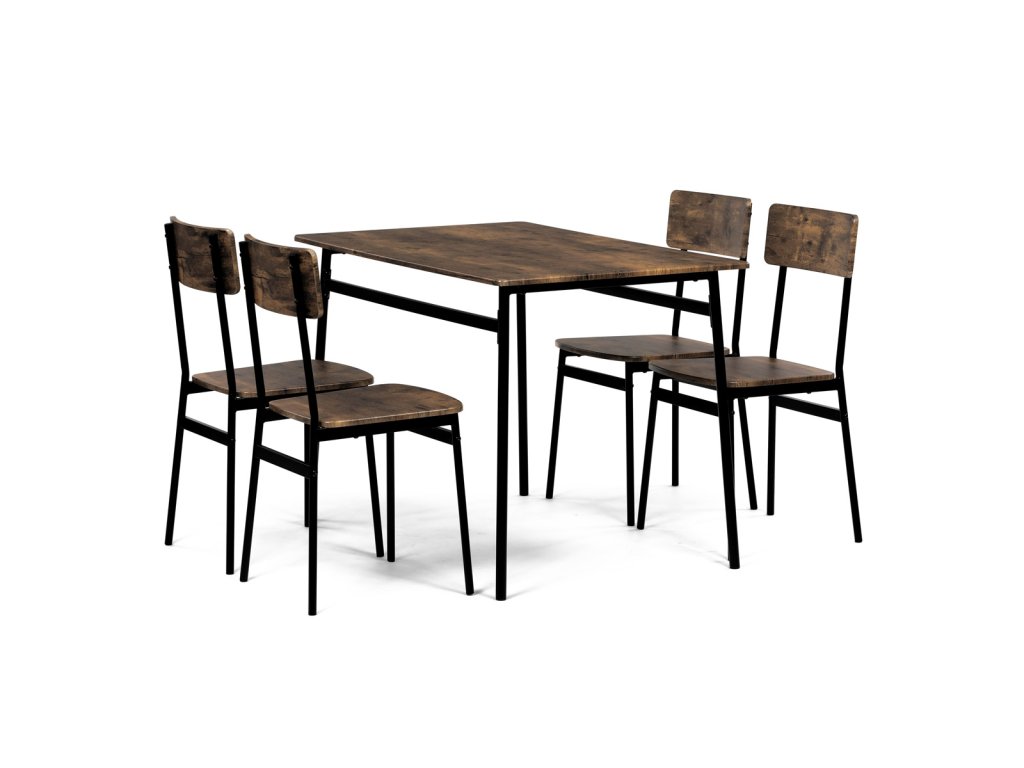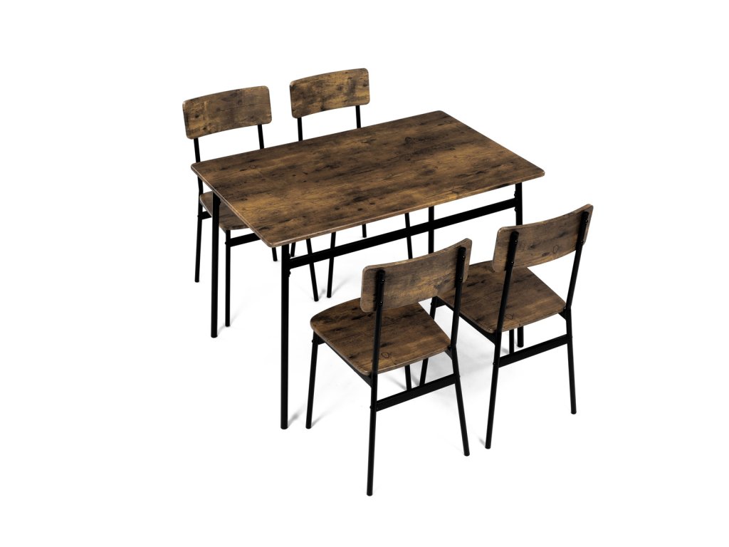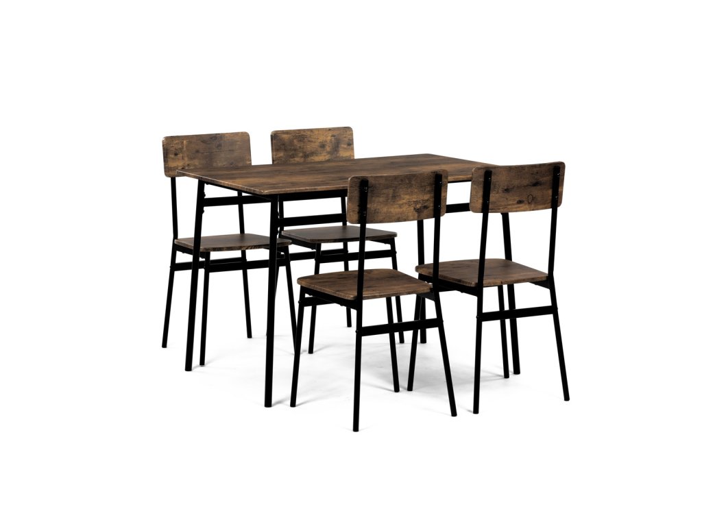 Jídelní set od značky Autronic v industriálním stylu je ideální volbou pro moderní interiéry. Sestava obsahuje stůl a čtyři židle s černýma kovovými nohama, které vytvářejí zajímavý kontrast s prkny v dekoru divokého dubu. Stůl i židle jsou vyrobeny z kvalitního MDF, které zaručuje vysokou odolnost a stabilitu. Tento set je navržen pro pohodlné stolování čtyř osob a perfektně se hodí do jídelny. Díky svému minimalistickému designu a přírodním tónům snadno zapadne do každého moderního domova.Doplňkové parametry