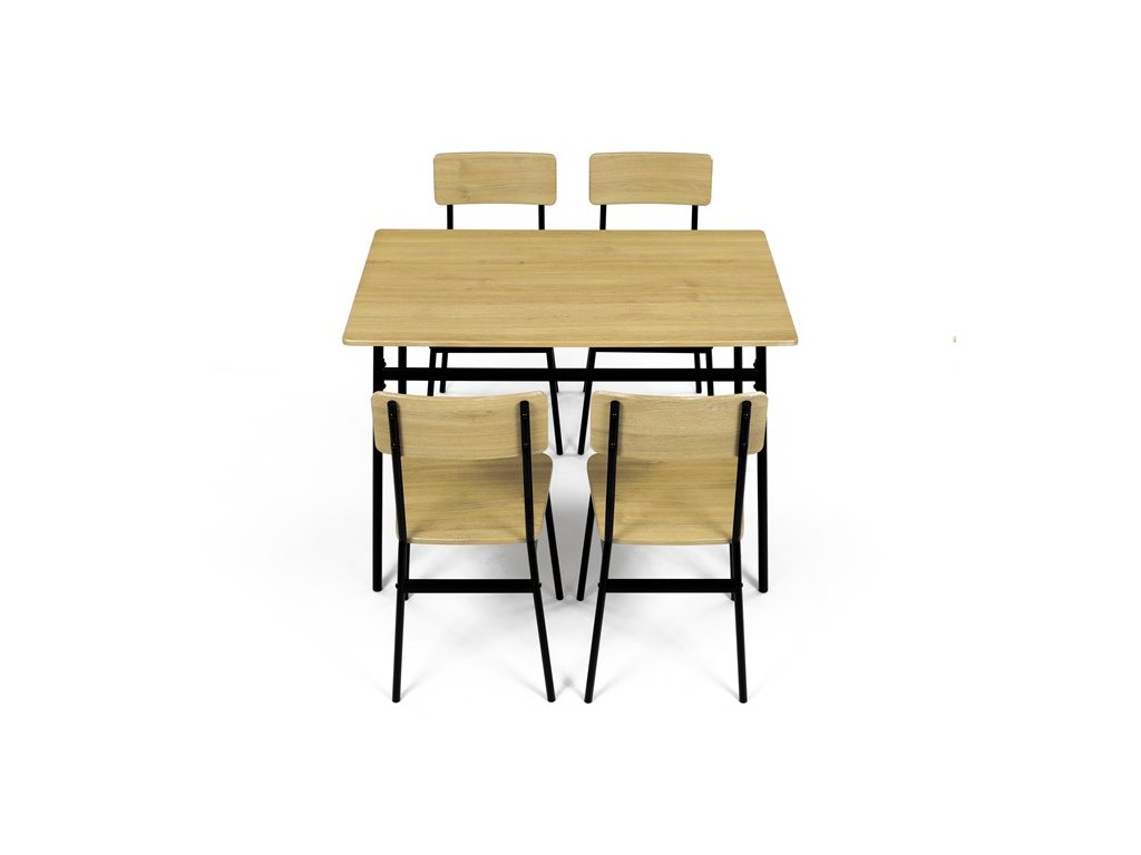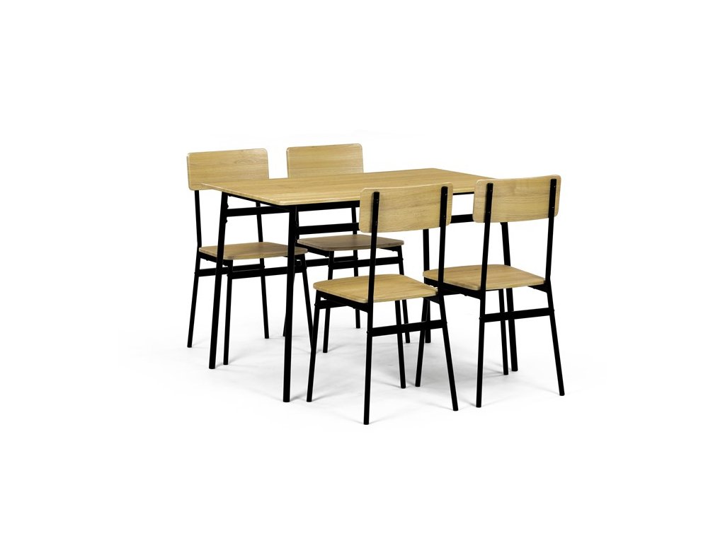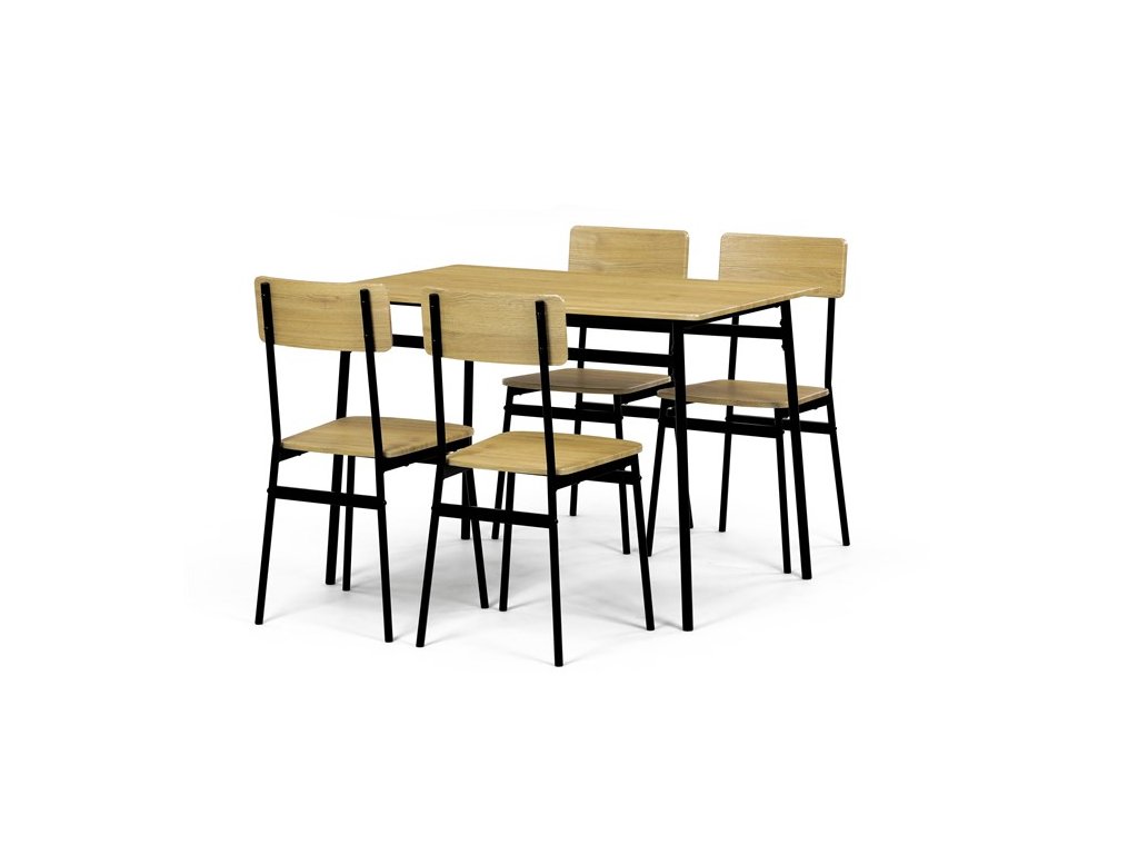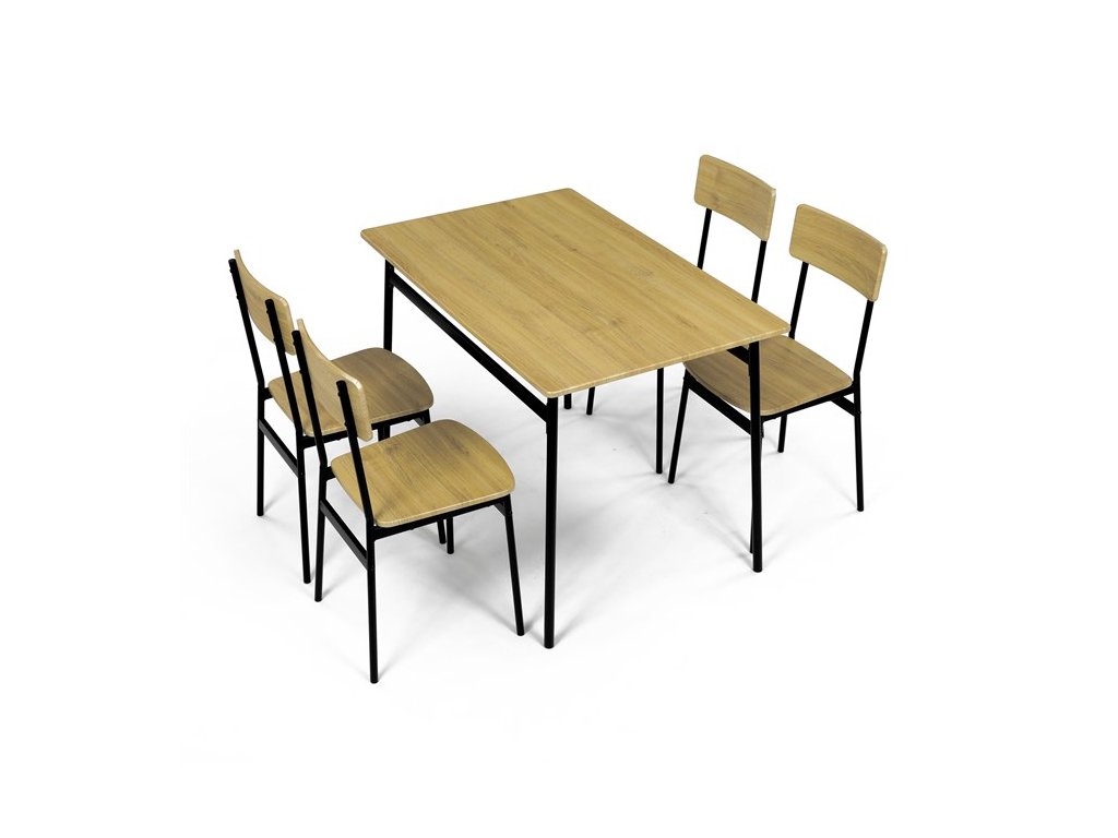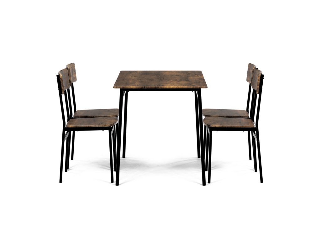 Jídelní set od značky Autronic v industriálním stylu je ideální volbou pro moderní interiéry. Sestava obsahuje stůl a čtyři židle s černýma kovovými nohama, které vytvářejí zajímavý kontrast s prkny v dekoru divokého dubu. Stůl i židle jsou vyrobeny z kvalitního MDF, které zaručuje vysokou odolnost a stabilitu. Tento set je navržen pro pohodlné stolování čtyř osob a perfektně se hodí do jídelny. Díky svému minimalistickému designu a přírodním tónům snadno zapadne do každého moderního domova.Doplňkové parametry