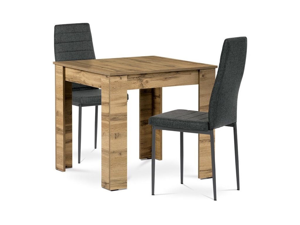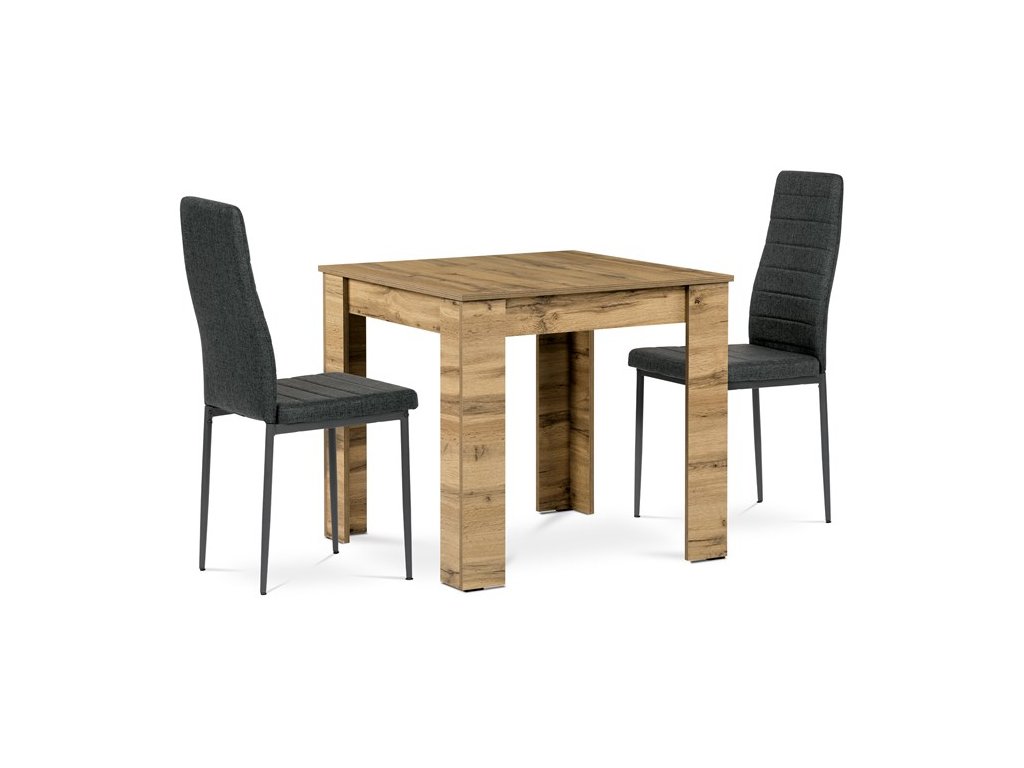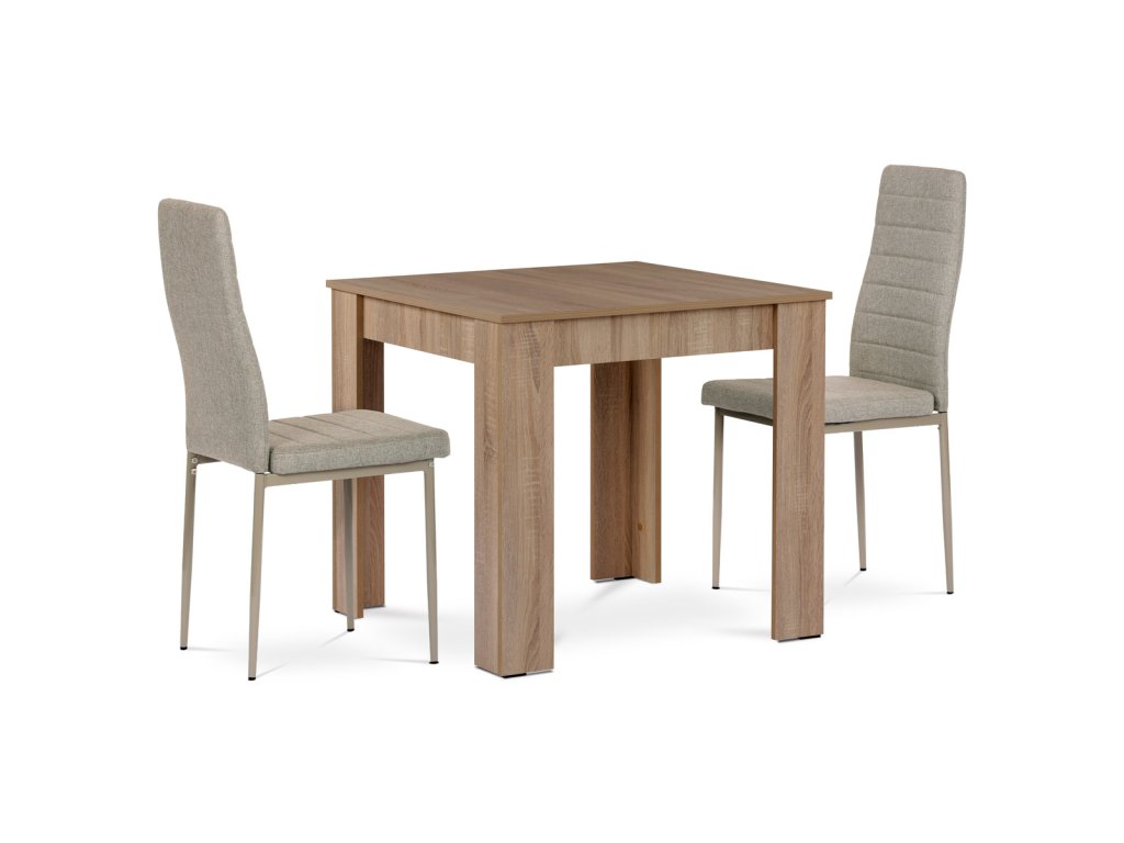 Jídelní set ve složení 1 ks stolu a 2 ks židlí:Jídelní stůl v minimalistickém designu a provedení. Je vyroben z kvalitních a pevných MDF dílů v povrchové úpravě lamino 3D dekor dub sonoma. Použitý materiál zajišťuje výbornou pevnost i stabilitu celého stolu. Nohy jsou opatřeny plastovými kluzáky, zamezujícími riziko poškození podlahy. Lamino je velmi odolné, výborně se udržuje a čistí.