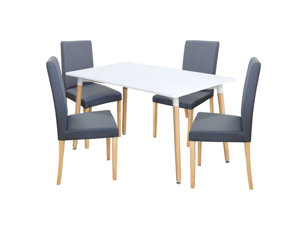 Jídelní set ONE PRIMA 4545 přináší styl a funkčnost do každodenního stolování. Stůl ONE 3152 s bílou MDF deskou je osazen stabilní kovovou konstrukcí v bílé barvě, která skvěle ladí s kulatými nohami z masivního buku. Díky rozměrům 140 × 90 cm poskytne dostatek místa i pro větší rodinný oběd.Součástí setu jsou čtyři židle PRIMA 3038 s pohodlným šedým textilním potahem. Kvalitní masivní konstrukce nohou v přírodním laku zajišťuje stabilitu a dlouhou životnost. Výška sedu 47 cm odpovídá ideálnímu ergonomickému nastavení pro pohodlné sezení u stolu.