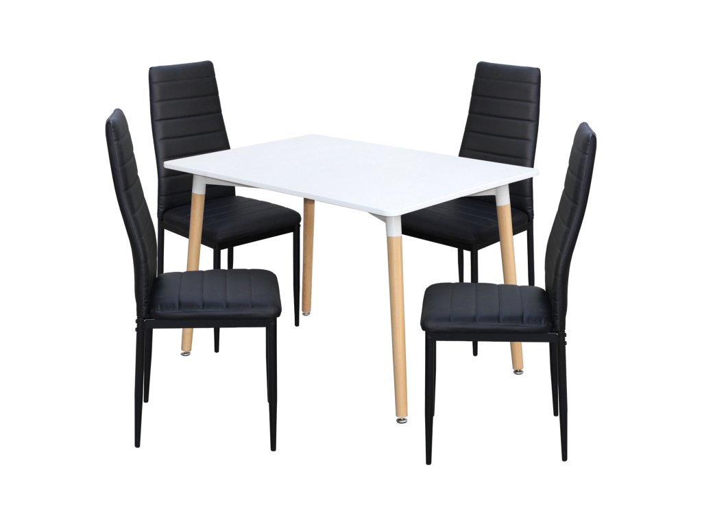 Elegantní jídelní set kombinuje moderní design a kvalitní materiály. Set obsahuje jídelní stůl ONE 3151 a čtyři židle SIGMA 3166, které dodají styl každé jídelně či kuchyni. Stůl má MDF desku v bílé barvě, pevnou kovovou konstrukci a kulaté nohy z masivního buku, což zajišťuje stabilitu a odolnost. Židle jsou čalouněné imitací kůže v černé barvě, s pevnou kovovou konstrukcí a výškou sedu 47 cm pro maximální komfort. Rozměry stolu: 120 × 80 × 74 cm, rozměry židle: 42 × 41 × 98 cm. Perfektní volba pro moderní i klasické interiéry.Doplňkové parametry