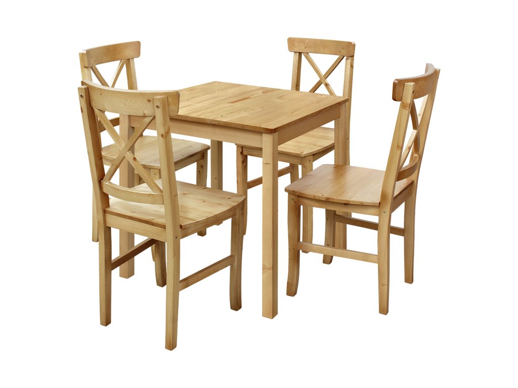 Stylový jídelní set z masivu bude ozdobou klasických interiérů, chalup i penzionů.Jídelní stůl 8842A a 4 židle 867A, materiál masiv borovice.