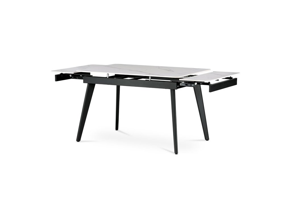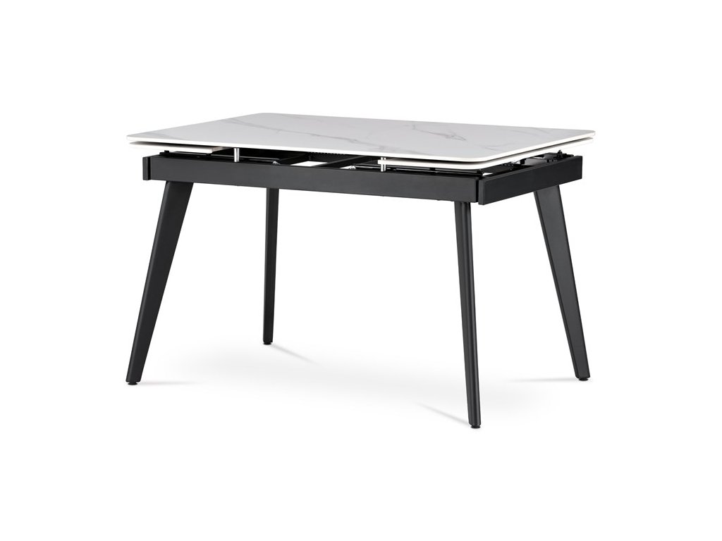 Designový jídelní rozkládací stůl o rozměru 120 + 30 + 30 x 80 cm v industriálním minimalistickém stylu. Vrchní stolová deska je tvrzené keramiky tl. 12 mm v matném dekoru "Bulharský šedý mramor". Konstrukce stolu i nohy jsou celokovové s nástřikem práškového vypalovacího laku v matném černém odstínu. Plastové kluzáky na nohách eliminují možnost počkození povrchů tvrdých podlah.Rozkládání je výsuvné, díly o šíři 30 cm se vysouvají z obou kratších stran, mechanika je celokovová a pro usnadnění jak výsuvu, tak i zajištění, je opatřena pružinami a plynovými písty.