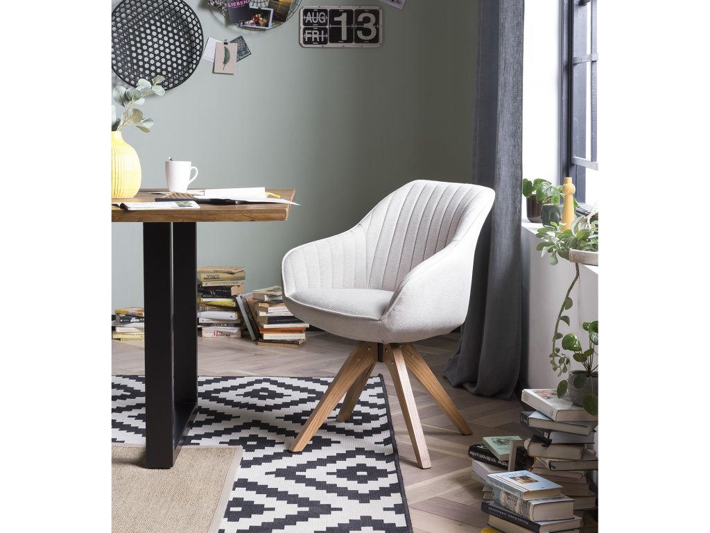 Pouze na objednání - dodání do 30 dnů, textilní potah, materiál 100% PES, barevné provedení béžová, nohy masiv dub, lakované provedení, výška sedu 47,5 cm, šířka sedu 57 cm, hloubka sedu 44 cm, výška područek 61-66 cm, otočná o 360°.Doplňkové parametry