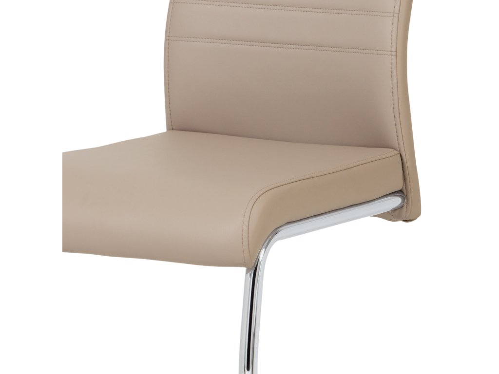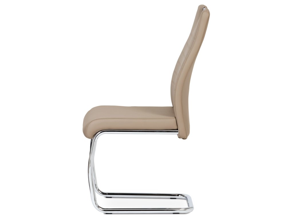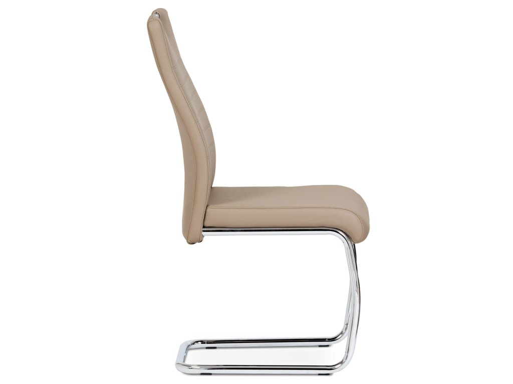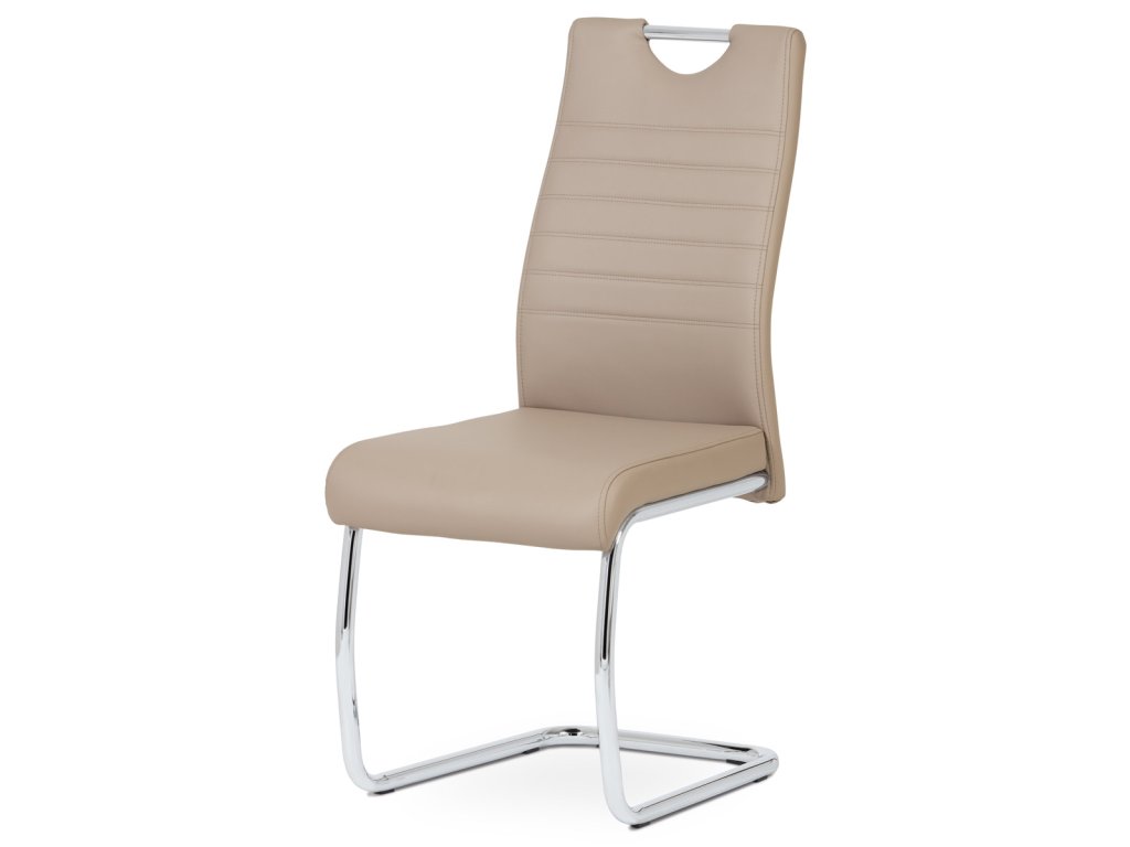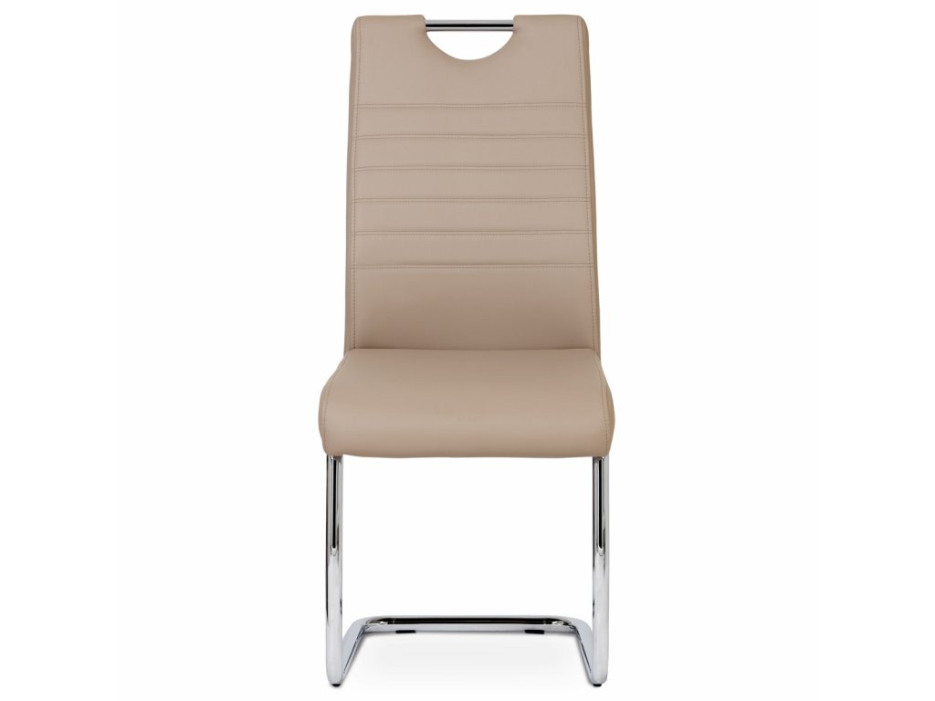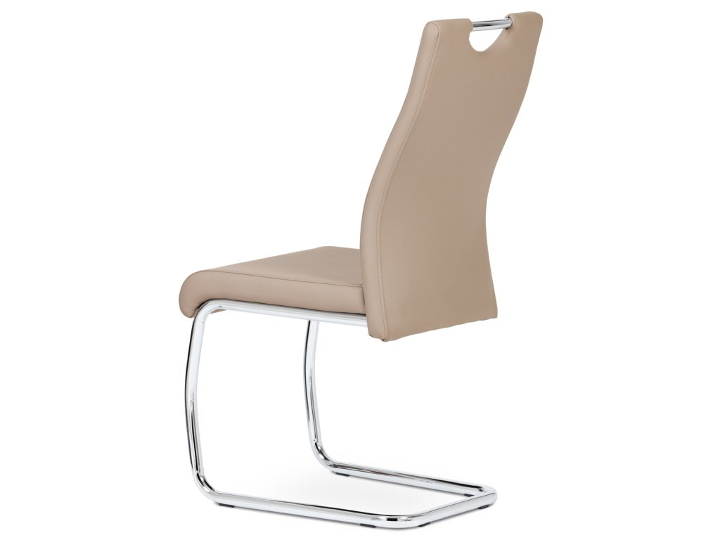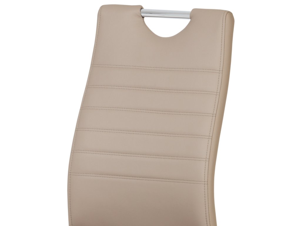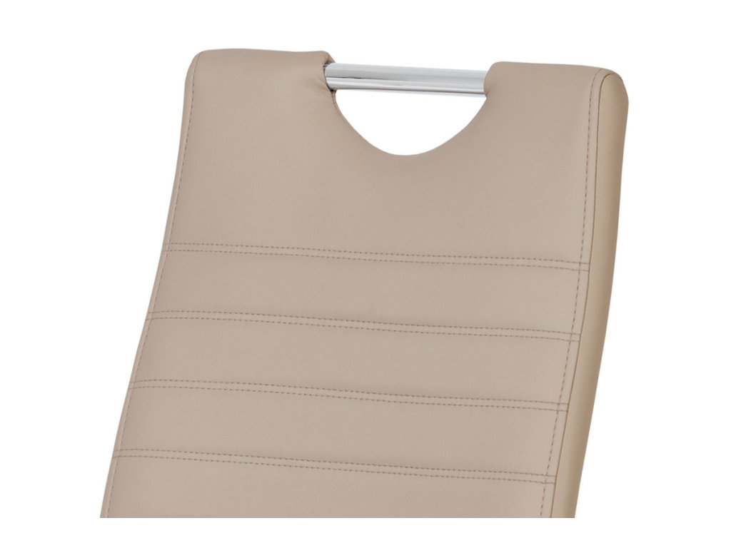 Moderní jídelní židle s dekorativně prošitým opěrákem je očalouněná koženkou v barvě cappuccino. Pochromované madlo a pohupová podnož jsou kruhového průřezu. Díky lehkému prohnutí podnože dochází k posunutí těžiště židle více dozadu, čímž je židle méně náchylná k překlopení dopředu. Lehké prohnutí též plní funkci estetickou, jelikož se jedná o design vskutku méně tradiční. Díky praktickému madlu je manipulace s židlí snadná, stejně jako údržba je bezproblémovou záležitostí. Nosnost do 110 kg.Doplňkové parametry