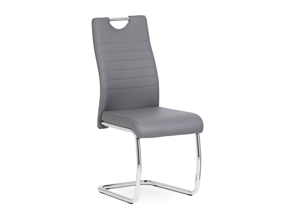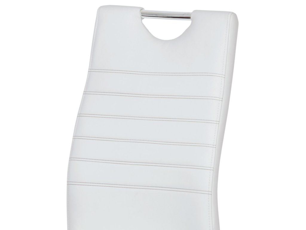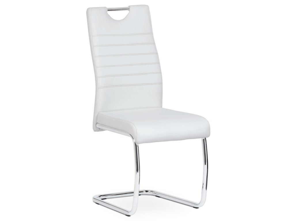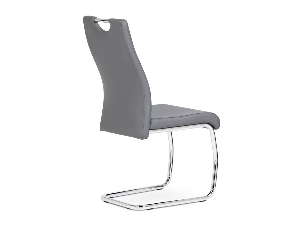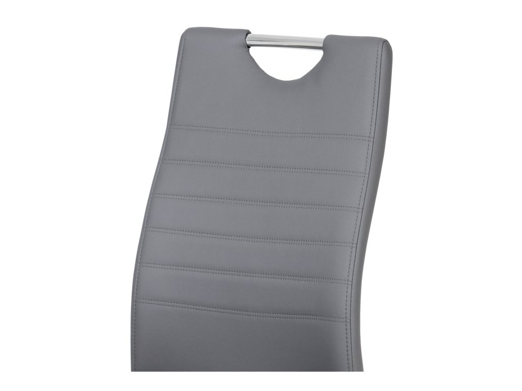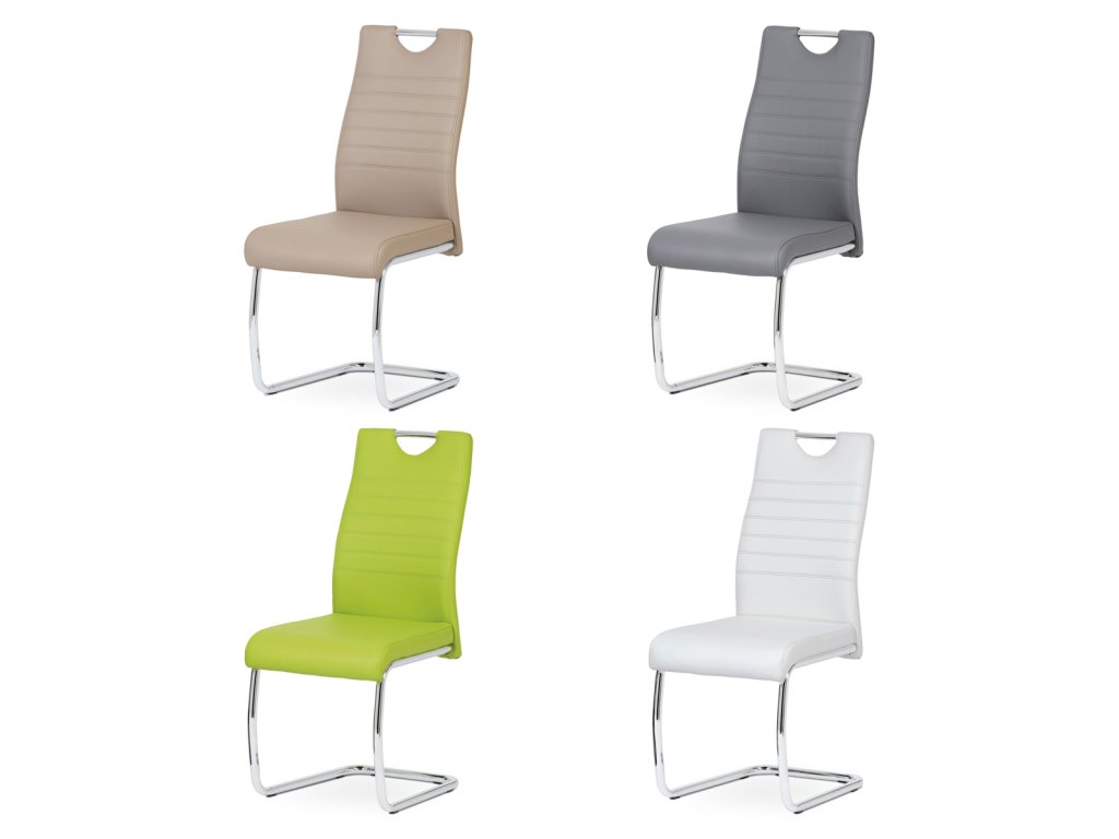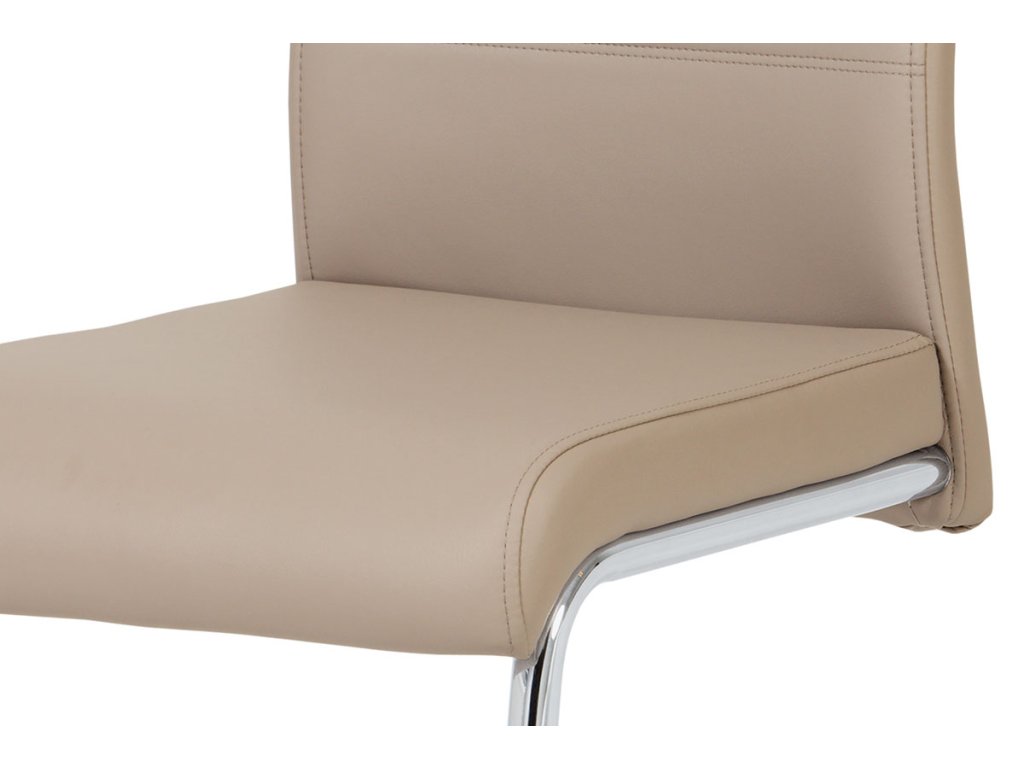Moderní jídelní židle s dekorativně prošitým opěrákem je očalouněná koženkou v barvě cappuccino. Pochromované madlo a pohupová podnož jsou kruhového průřezu. Díky lehkému prohnutí podnože dochází k posunutí těžiště židle více dozadu, čímž je židle méně náchylná k překlopení dopředu. Lehké prohnutí též plní funkci estetickou, jelikož se jedná o design vskutku méně tradiční. Díky praktickému madlu je manipulace s židlí snadná, stejně jako údržba je bezproblémovou záležitostí. Nosnost do 110 kg.Doplňkové parametry