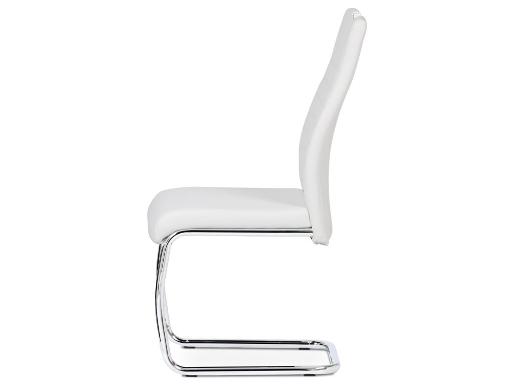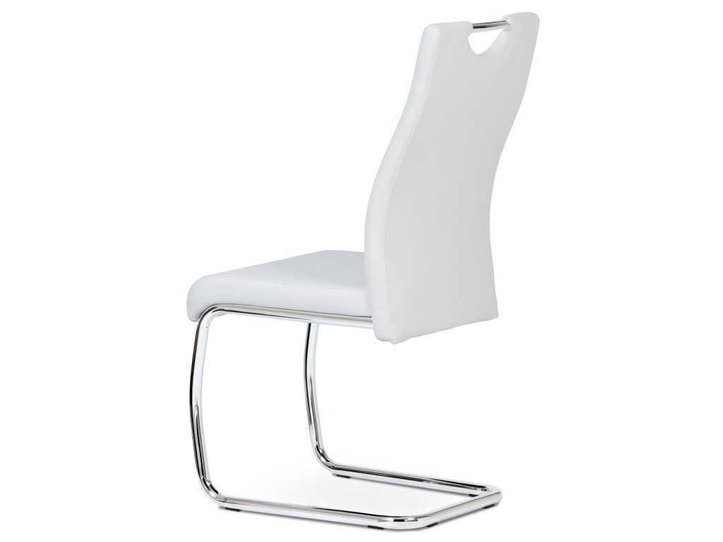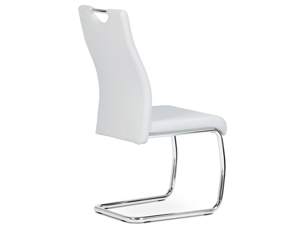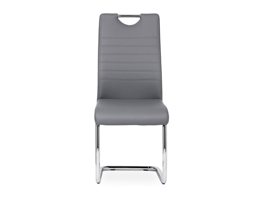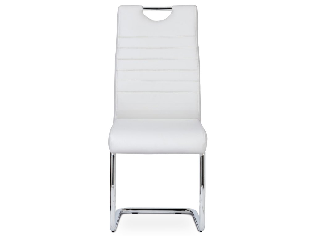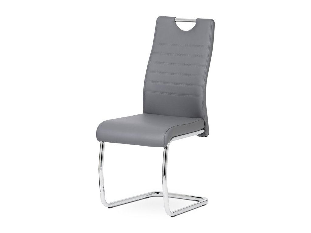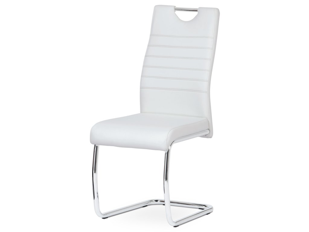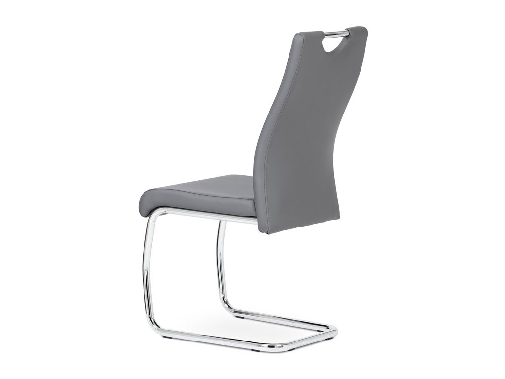 Moderní jídelní židle s dekorativně prošitým opěrákem je očalouněná koženkou v barvě cappuccino. Pochromované madlo a pohupová podnož jsou kruhového průřezu. Díky lehkému prohnutí podnože dochází k posunutí těžiště židle více dozadu, čímž je židle méně náchylná k překlopení dopředu. Lehké prohnutí též plní funkci estetickou, jelikož se jedná o design vskutku méně tradiční. Díky praktickému madlu je manipulace s židlí snadná, stejně jako údržba je bezproblémovou záležitostí. Nosnost do 110 kg.Doplňkové parametry