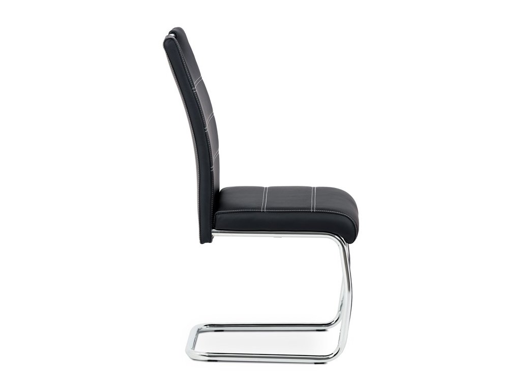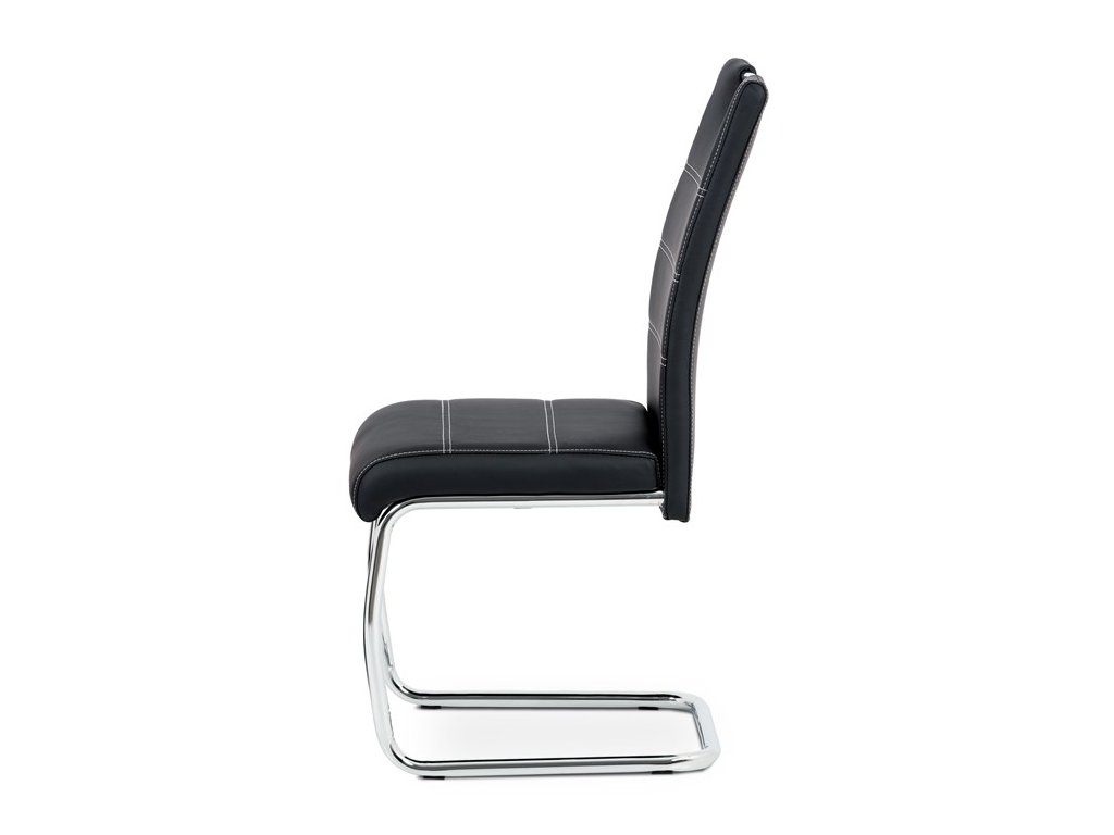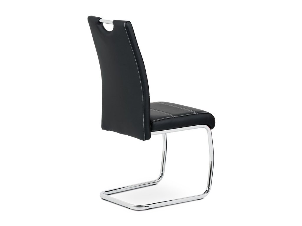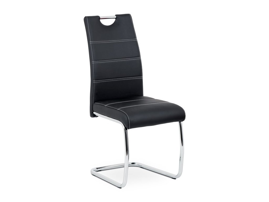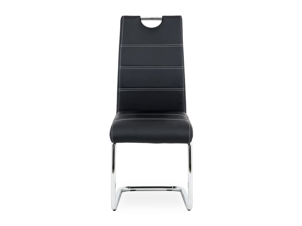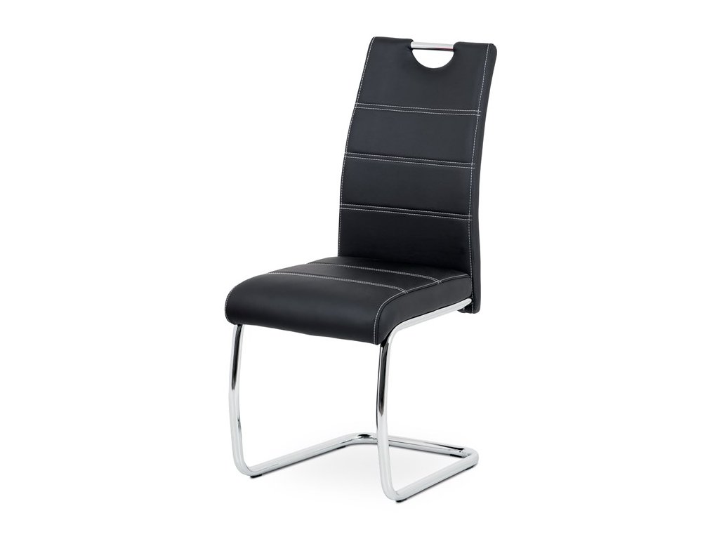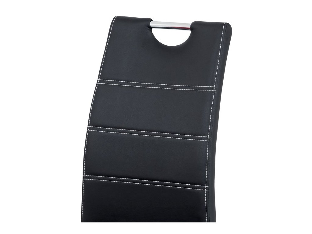 Moderní jídelní židle je čalouněná černou ekokůží s dekorativním bílým prošitím sedáku i opěráku. Moderní vzhled podtrhuje kovová pohupová podnož s chromovou úpravou. Podnož je navíc speciálně tvarovaná pro lepší stabilitu a bezpečí a je na šesti černých plastových kluzácích, které sníží riziko poškození Vaší podlahy. Pro snazší manipulaci má židle i madlo v horní části opěráku, které je kovové a též s chromovou úpravou. Nosnost židle je až 110 kg.Doplňkové parametry