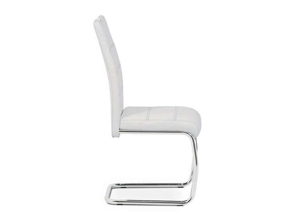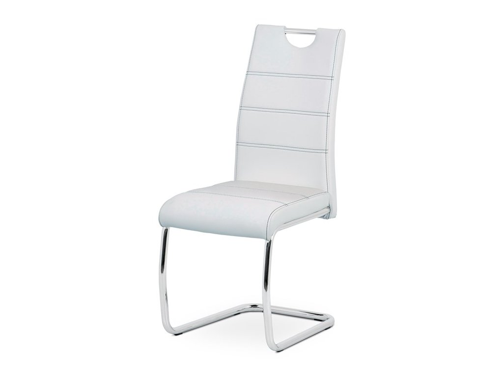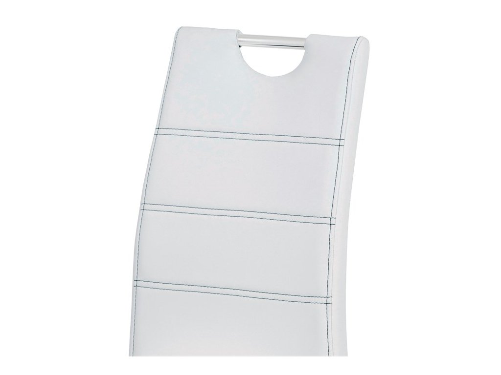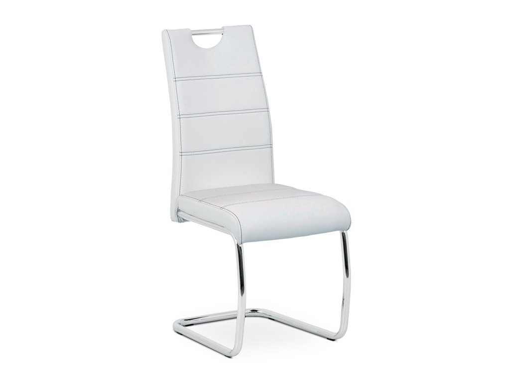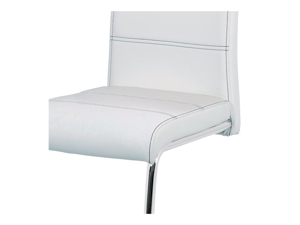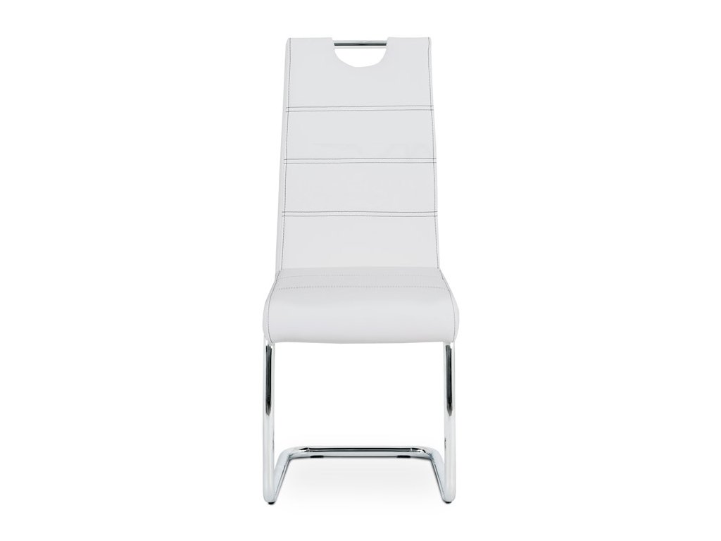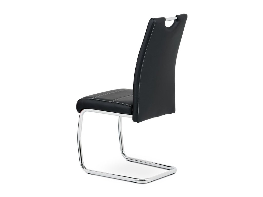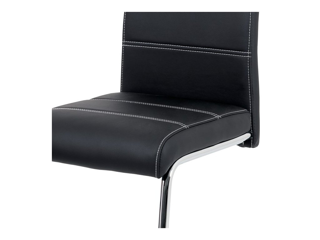 Moderní jídelní židle je čalouněná černou ekokůží s dekorativním bílým prošitím sedáku i opěráku. Moderní vzhled podtrhuje kovová pohupová podnož s chromovou úpravou. Podnož je navíc speciálně tvarovaná pro lepší stabilitu a bezpečí a je na šesti černých plastových kluzácích, které sníží riziko poškození Vaší podlahy. Pro snazší manipulaci má židle i madlo v horní části opěráku, které je kovové a též s chromovou úpravou. Nosnost židle je až 110 kg.Doplňkové parametry