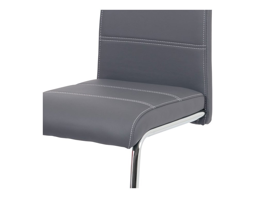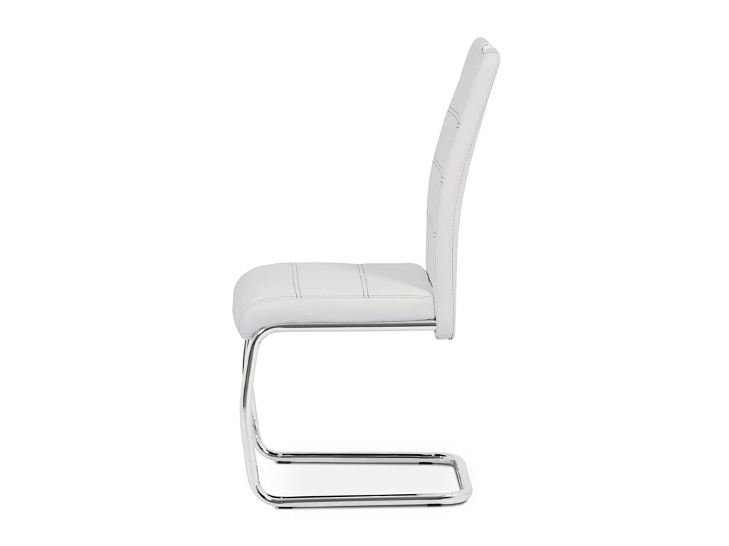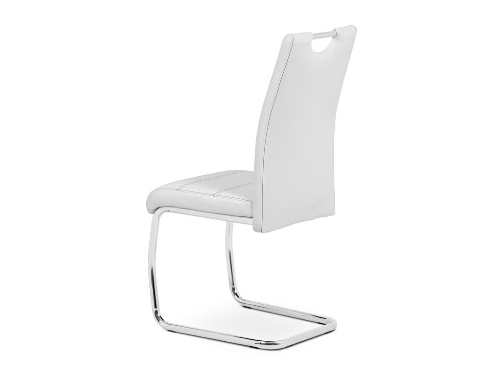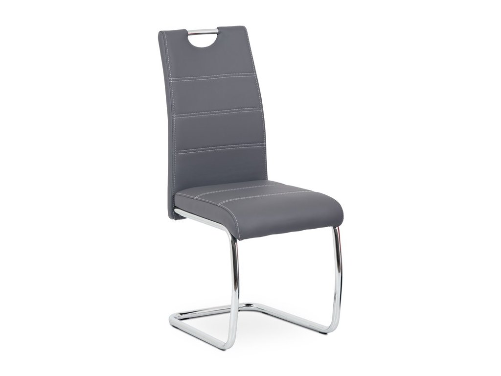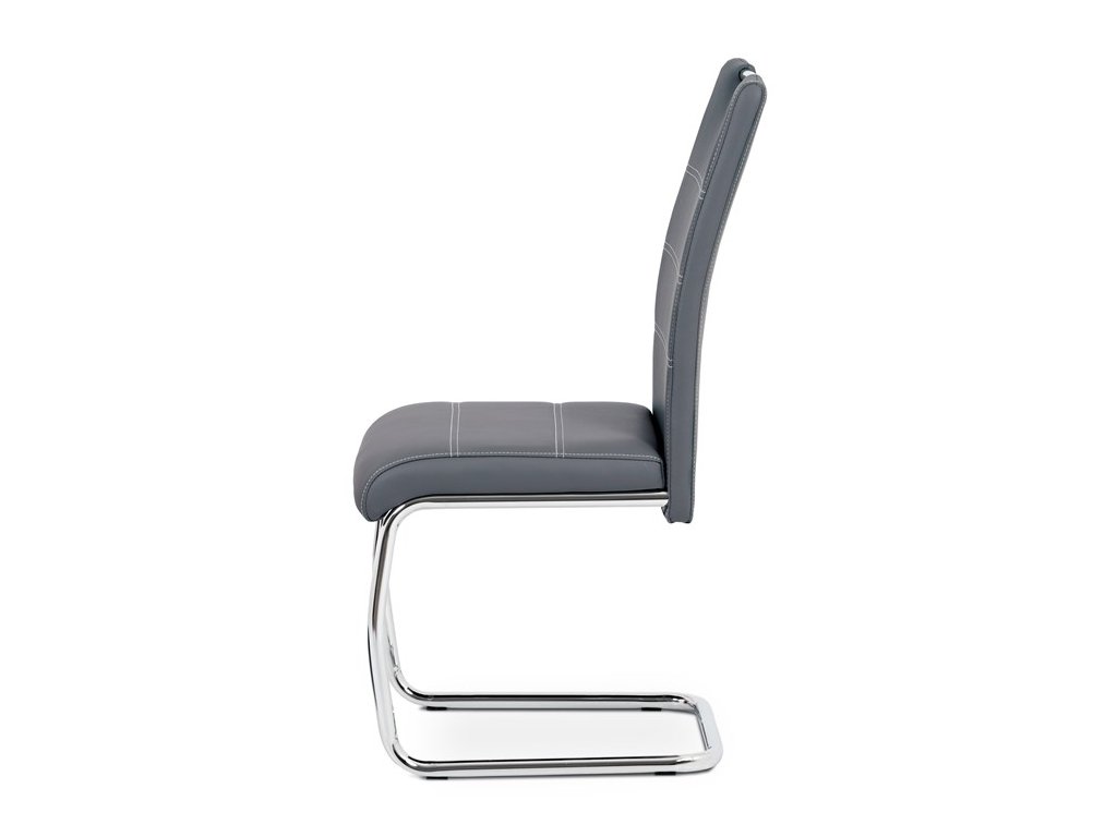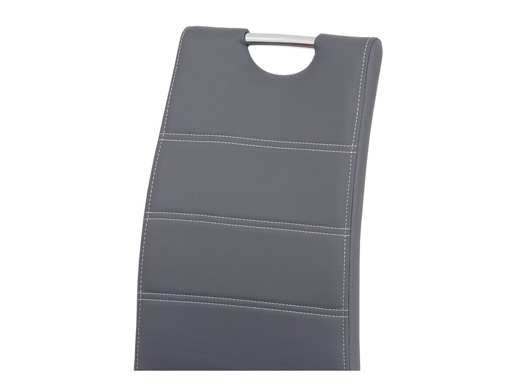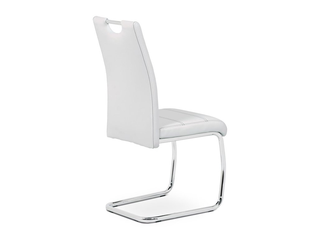 Moderní jídelní židle je čalouněná černou ekokůží s dekorativním bílým prošitím sedáku i opěráku. Moderní vzhled podtrhuje kovová pohupová podnož s chromovou úpravou. Podnož je navíc speciálně tvarovaná pro lepší stabilitu a bezpečí a je na šesti černých plastových kluzácích, které sníží riziko poškození Vaší podlahy. Pro snazší manipulaci má židle i madlo v horní části opěráku, které je kovové a též s chromovou úpravou. Nosnost židle je až 110 kg.Doplňkové parametry