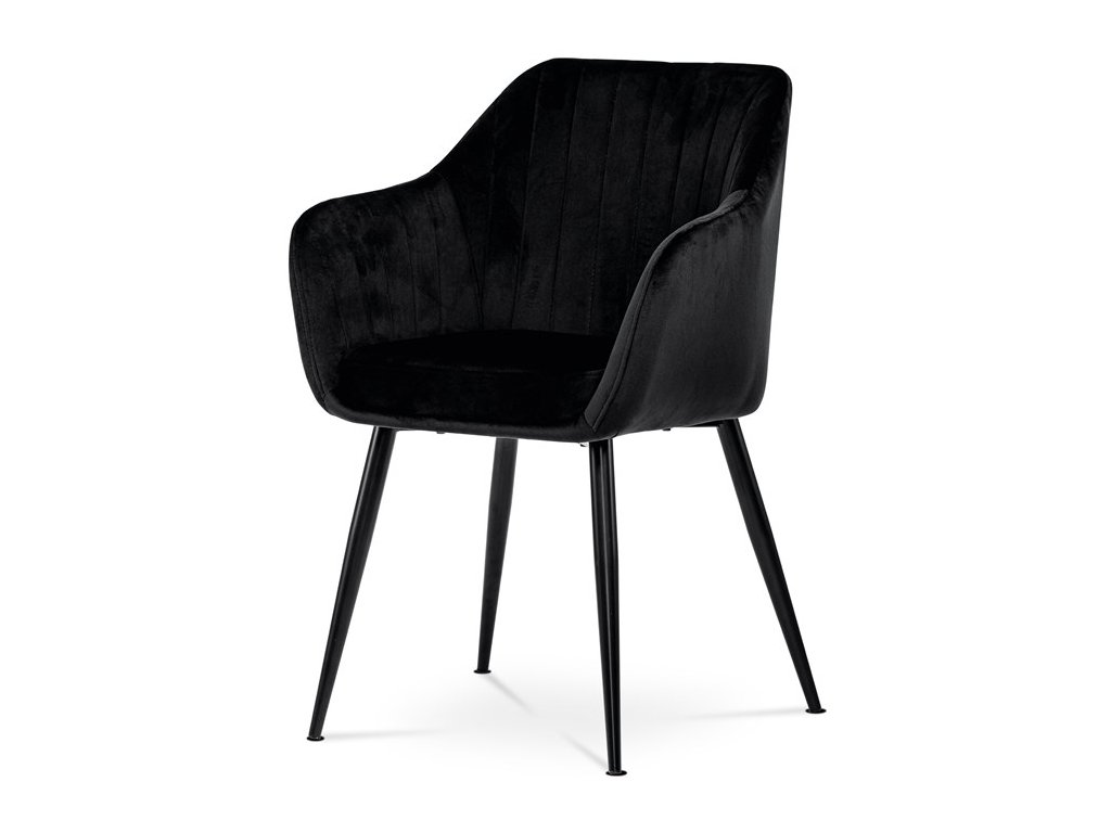 Dokonalý design, industriální styl a perfektní pohodlí je pro tuto židli samozřejmostí. Skořepina sedáku i opěradla má pevnou kovovou kostru, potah z velmi kvalitní sametové látky v matném provedení a nadčasovém a luxusním odstínu černé. Polstrování je z PU pěny. Bonusem ke zvýšení pohodlí posedu je 8 cm zvýšený a extra polstrovaný sedák a praktické pohodlné opěrky s opěrnou plochou ve výšce 69 cm od podlahy. Příjemný dekorativní prvek vytvářejí svislá prošití vnitřních částí opěradla i boků. Použitá látka je velmi odolná a perfektně se čistí.Stabilitu židle zajišťují čtyři kónické kovové nohy s kvalitním práškovým nástřikem v černé matné barvě. Ukončené jsou černými plastovými kluzáky, zabraňující poškození tvrdých povrchů podlah. Nohy mají kruhový průřez o průměru od 2 do 3,5 cm v horní části.