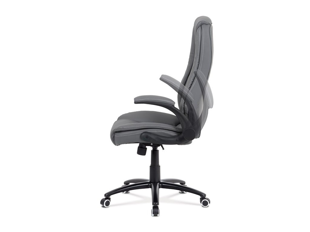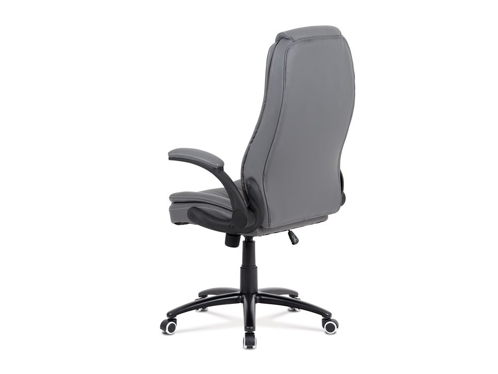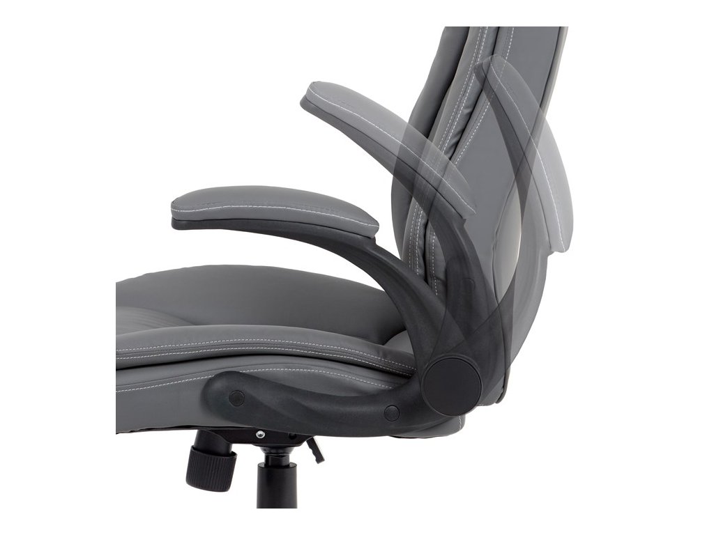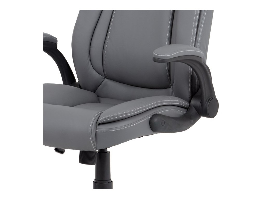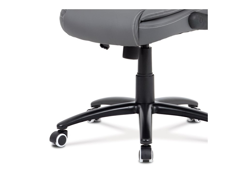 Moderní kancelářská židle je potažena jemnou ekokůží šedé barvy s kontrastním elegantním bílým prošitím. Výplň je v kvalitní PU pěny, která zaručuje příjemné dlouhodobé sezení. Díky výplni i stylově tvarovanému sedáku a opěráku s velmi měkkým podhlavníkem se budete cítit maximálně pohodlně. Ruce si můžete pohodlně opřít o odklápěcí plastové područky černé barvy s polstrováním šedou ekokůží. Židle má také i snadno omyvatelný zesílený kovový kříž matné černé barvy s plastovými kolečky vhodnými na tvrdé typy podlah (dlažba, parkety, plovoucí podlahy apod.). Židle je výškově nastavitelná, s houpacím mechanismem a předním šroubem upravující tuhost pohupu. Nosnost židle je až 120 kg.Doplňkové parametry