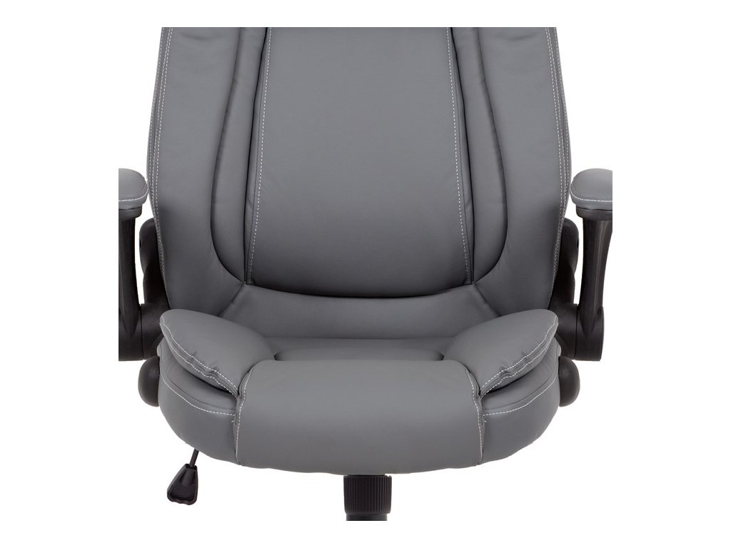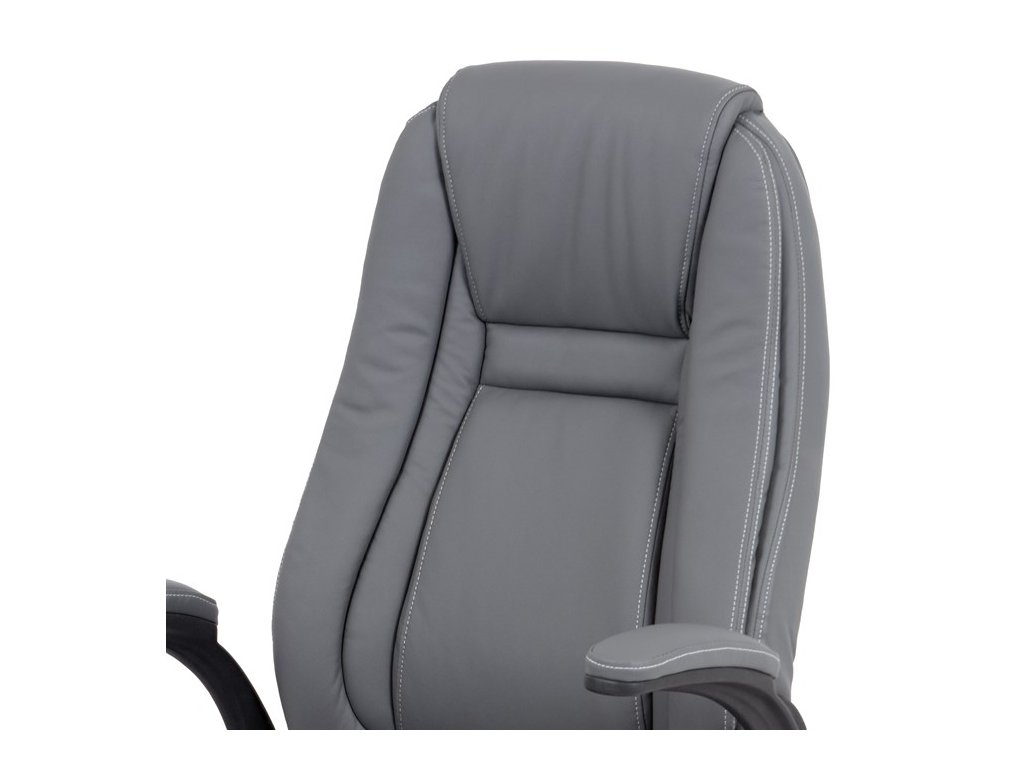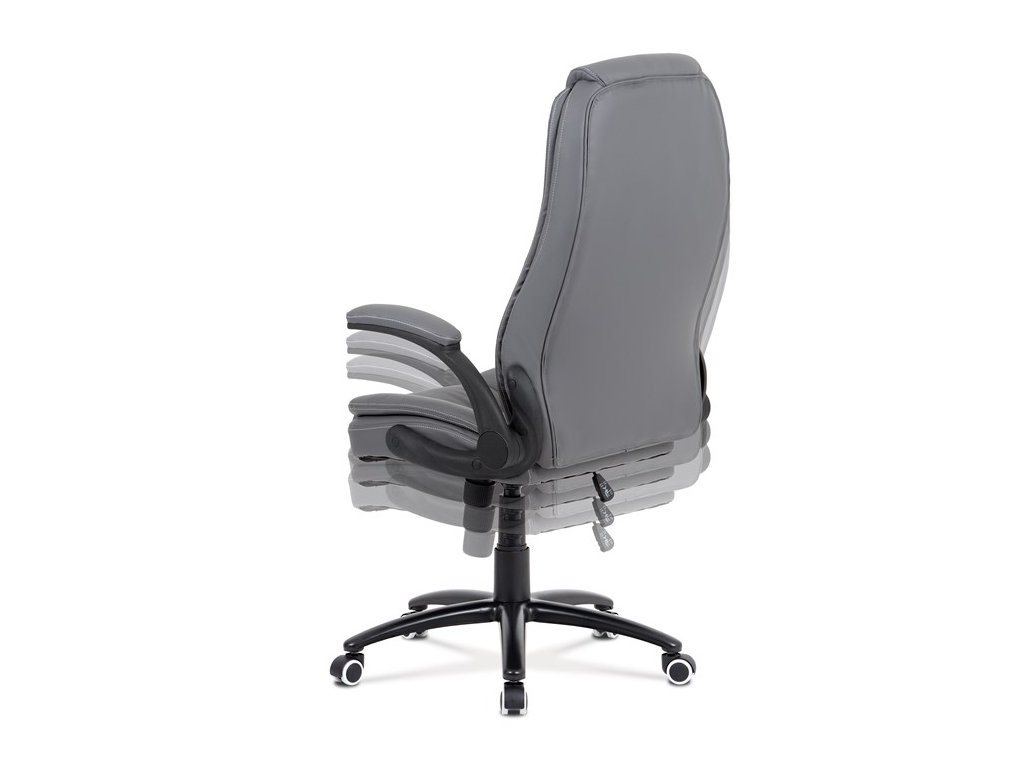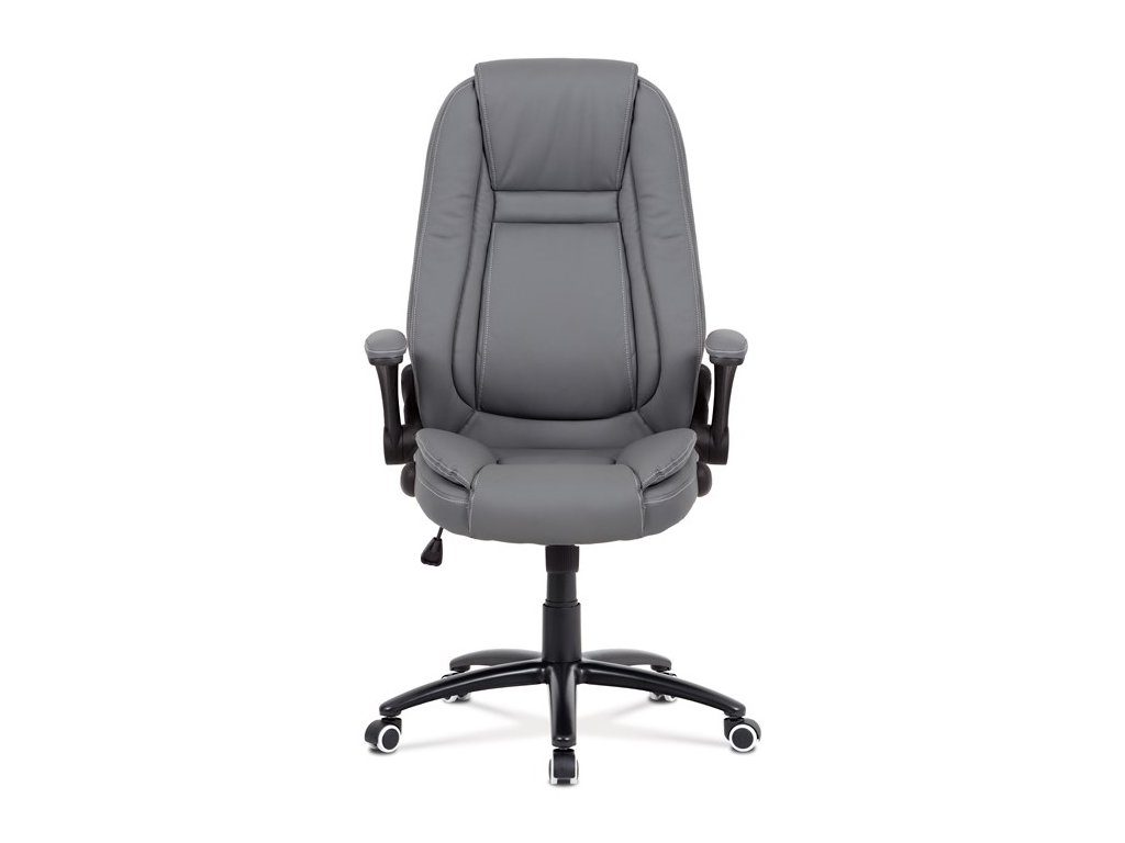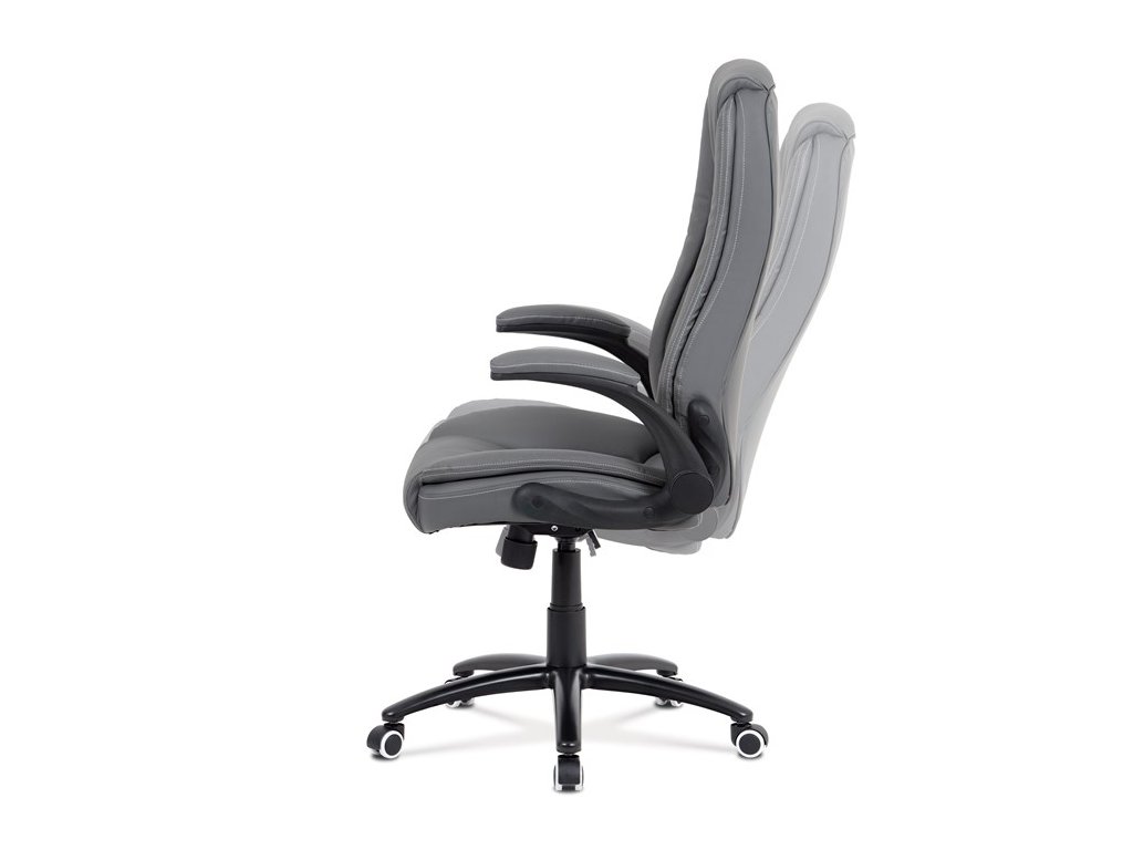 Moderní kancelářská židle je potažena jemnou ekokůží šedé barvy s kontrastním elegantním bílým prošitím. Výplň je v kvalitní PU pěny, která zaručuje příjemné dlouhodobé sezení. Díky výplni i stylově tvarovanému sedáku a opěráku s velmi měkkým podhlavníkem se budete cítit maximálně pohodlně. Ruce si můžete pohodlně opřít o odklápěcí plastové područky černé barvy s polstrováním šedou ekokůží. Židle má také i snadno omyvatelný zesílený kovový kříž matné černé barvy s plastovými kolečky vhodnými na tvrdé typy podlah (dlažba, parkety, plovoucí podlahy apod.). Židle je výškově nastavitelná, s houpacím mechanismem a předním šroubem upravující tuhost pohupu. Nosnost židle je až 120 kg.Doplňkové parametry