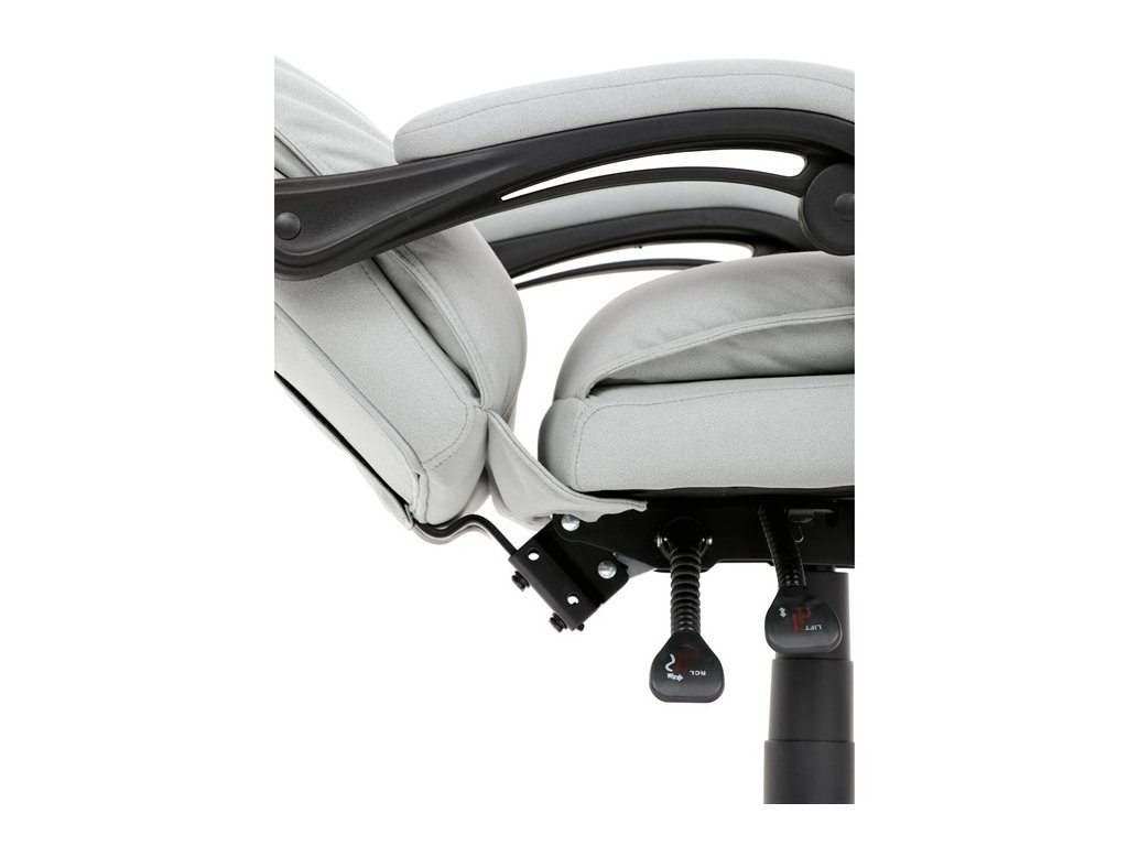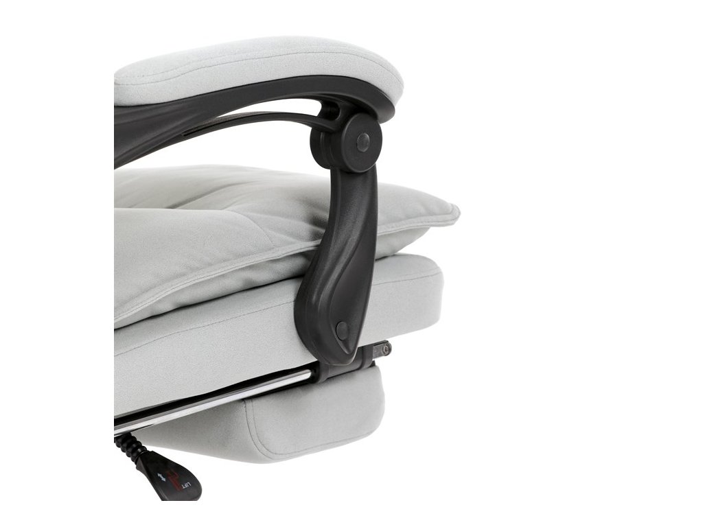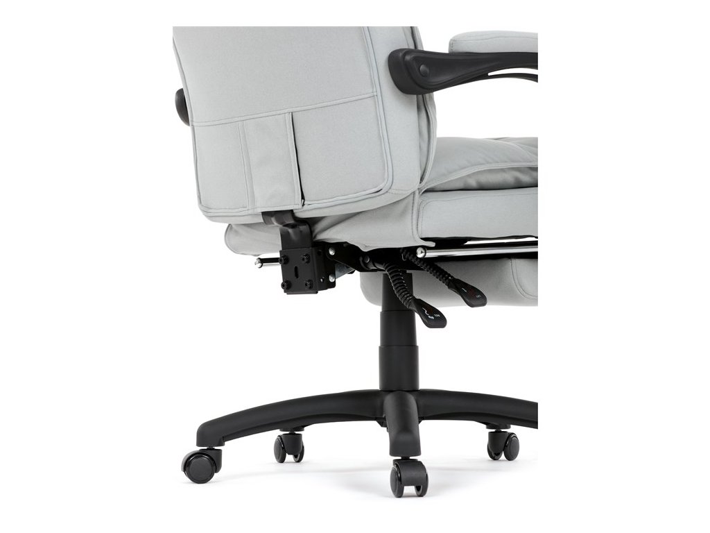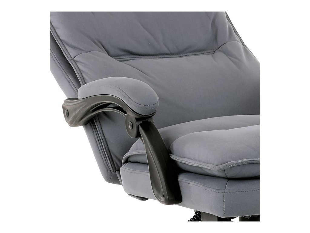 Vysoký, částečně prodyšný a ergonomicky navržený dvojitý opěrák s výrazným příčným dvojitým prošíváním s integrovanou opěrkou hlavy slouží nejen jako výborná opora celých zad a také podporuje správné držení páteře. Područky jsou plastové, polstrované a potažené šedou látkou. Šíře je 8 cm, délka ložné plochy je úžasných 37 cm a výška 3 cm. Při sklápění sedáku se pohybují a kopírují jeho pohyb a polohu. Vaše ruce budou mít při odpočinku dokonalou a velmi měkkou podporu. Jako TOP vybavení slouží výsuvná a výklopná polstrovaná podnožka. Nosnost židle je až 130 kg.