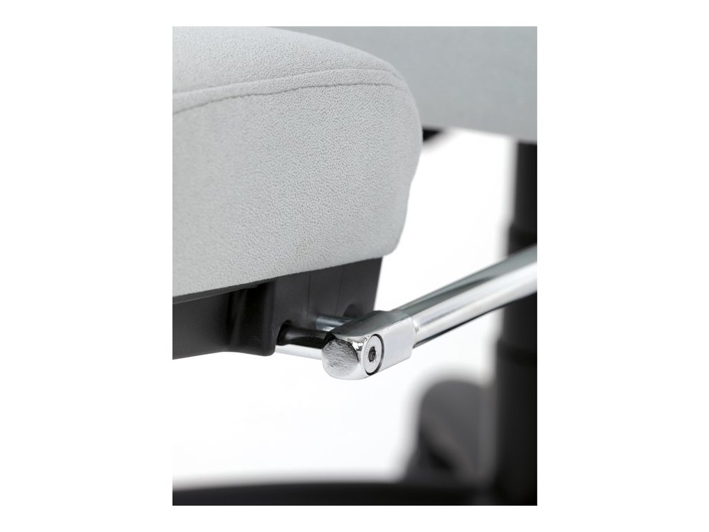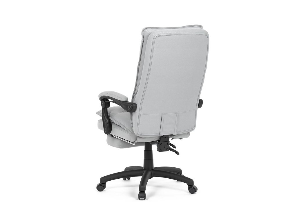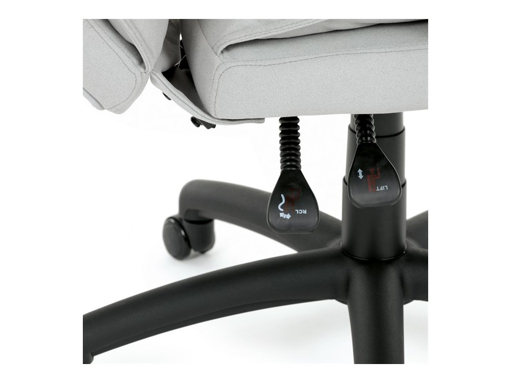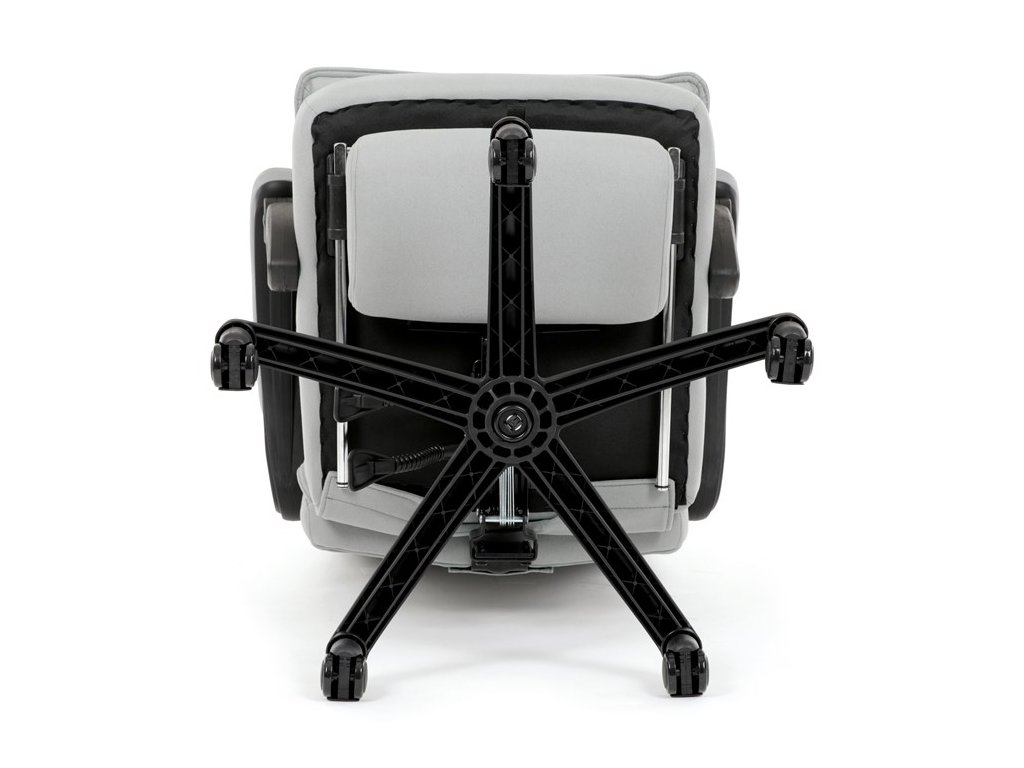 Vysoký, částečně prodyšný a ergonomicky navržený dvojitý opěrák s výrazným příčným dvojitým prošíváním s integrovanou opěrkou hlavy slouží nejen jako výborná opora celých zad a také podporuje správné držení páteře. Područky jsou plastové, polstrované a potažené šedou látkou. Šíře je 8 cm, délka ložné plochy je úžasných 37 cm a výška 3 cm. Při sklápění sedáku se pohybují a kopírují jeho pohyb a polohu. Vaše ruce budou mít při odpočinku dokonalou a velmi měkkou podporu. Jako TOP vybavení slouží výsuvná a výklopná polstrovaná podnožka. Nosnost židle je až 130 kg.