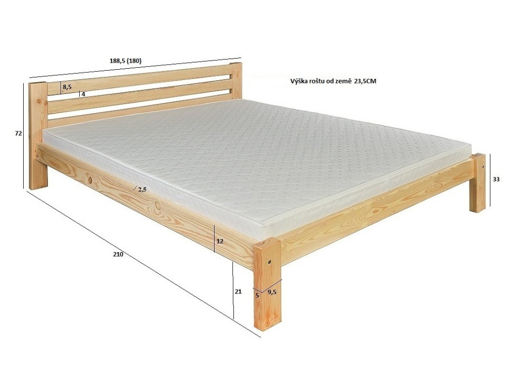 Stylová postel. Postel je vyrobena z kvalitního borovicového dřeva, které přinese do Vaší domácnosti tu správnou přírodní atmosféru a vůni dřeva. Základní borovicové dřevo je bez moření, můžete si však objednat i moření olše, dub, grey nebo ořech za 10% příplatek. Postel neobsahuje rošt a matraci. Vhodný rozměr 180 x 200 cm. Jednotlivé části nábytku tohoto výrobce lze různě kombinovat, čímž docílíte dokonalé harmonie a přitažlivého vzhledu Vašeho domova. Poněvadž má dřevo povrchovou úpravu proti škůdcům a vy budete mít zájem namořit si nábytek sami, napište do poznámek k objednávce - "Bez povrchové úpravy".Doplňkové parametry