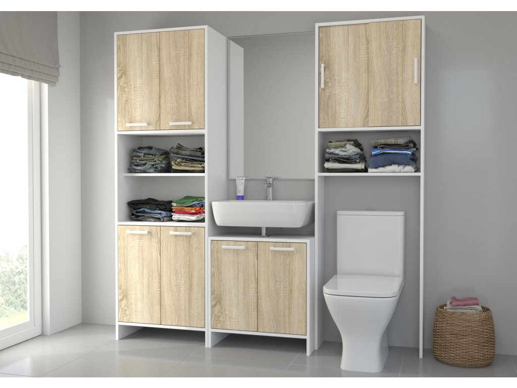 Kombinovaná skříň dvoudvéřová, stylová a zároveň vhodná do moderních interiérů. V horní i dolná části je jednodveřová skříňka, uprostře jsou police. Korpus i dvířka jsou vyrobeny z desky LTD 16 mm potažené PVC folií v barvě bílá/dvířka v dub sonoma. Zadní strana je ze sololitu. Úchyty jsou plastové. Naleznete zde dostatek prvků, ze kterých si sestavíte koupelnu dle Vašich představ. Dodáváme v demontovaném stavu.Doplňkové parametry