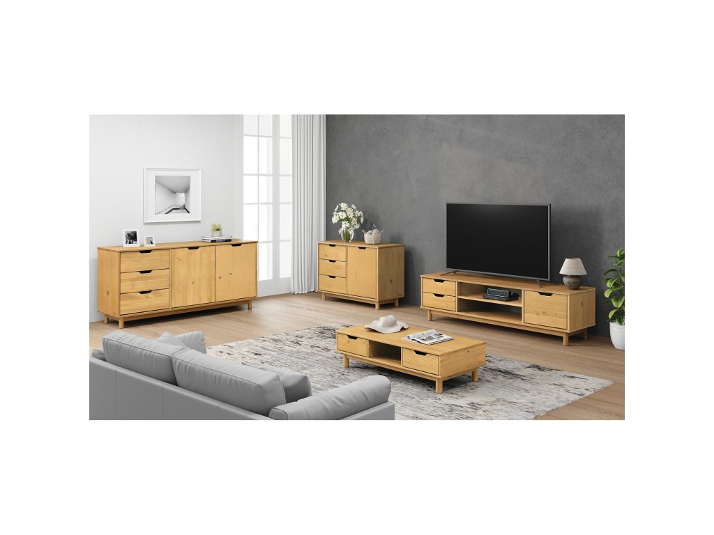 Komoda BONITO 2 vosk 32431V je praktická komoda z masivní borovice, která nabídne kombinaci zásuvek a uzavřeného úložného prostoru pro přehledné uspořádání věcí v domácnosti. Povrch je ošetřen voskem v medovém odstínu, který zvýrazňuje kresbu dřeva a dodává komodě teplý, přírodní vzhled.Komoda má 3 zásuvky s kovovými pojezdy pro plynulé vysouvání a pohodlné každodenní používání. Dále je vybavená 2 dvířky a uvnitř se nachází 1 police, která pomůže úložný prostor rozdělit a udržet pořádek. Díky tomuto členění se komoda hodí do ložnice, předsíně i obývacího pokoje.