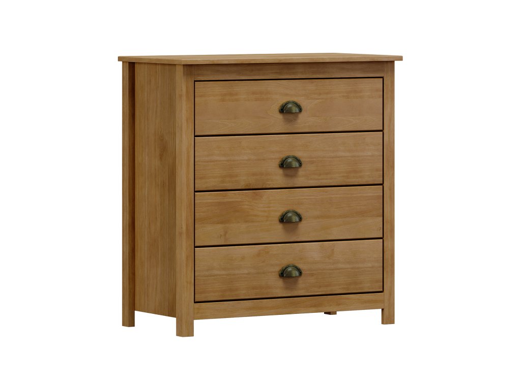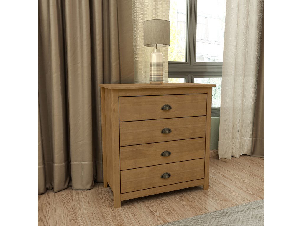 Komoda 4 zásuvky TOPAZIO 206261D dubElegantní a praktická komoda z masivní borovice v dubovém provedení je ideální volbou pro ty, kteří hledají spojení kvalitního zpracování a nadčasového designu.