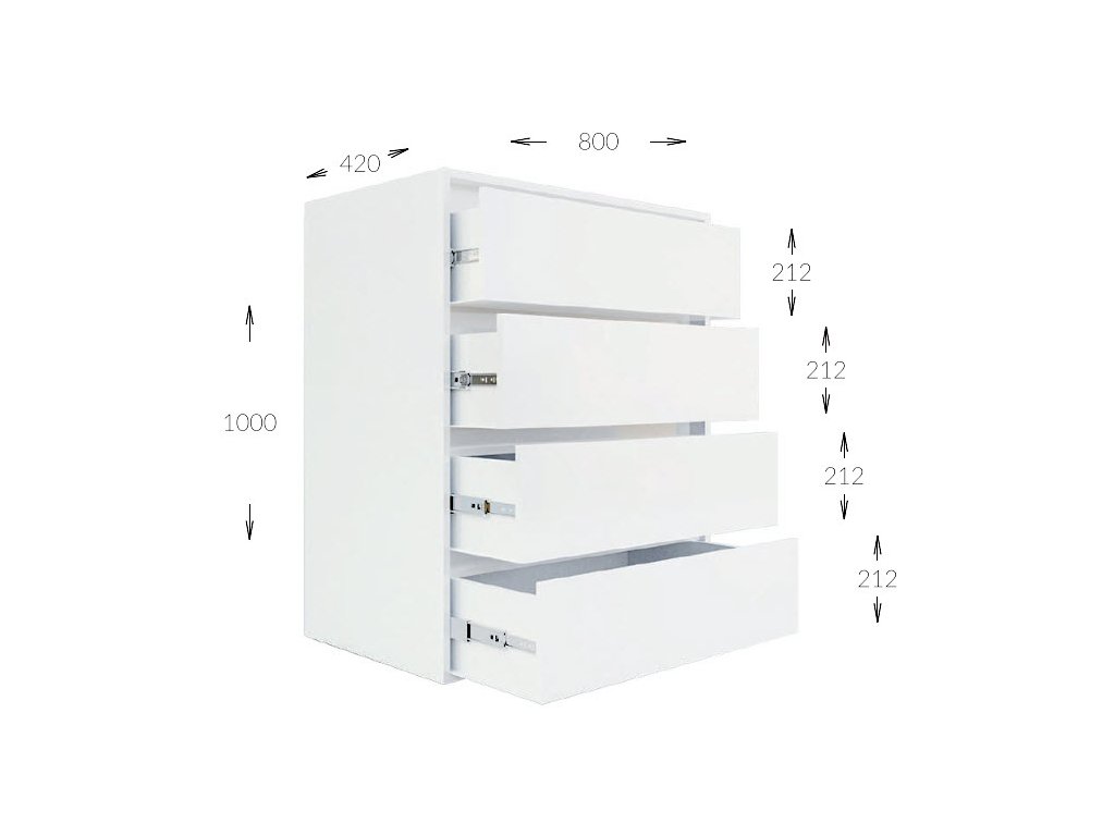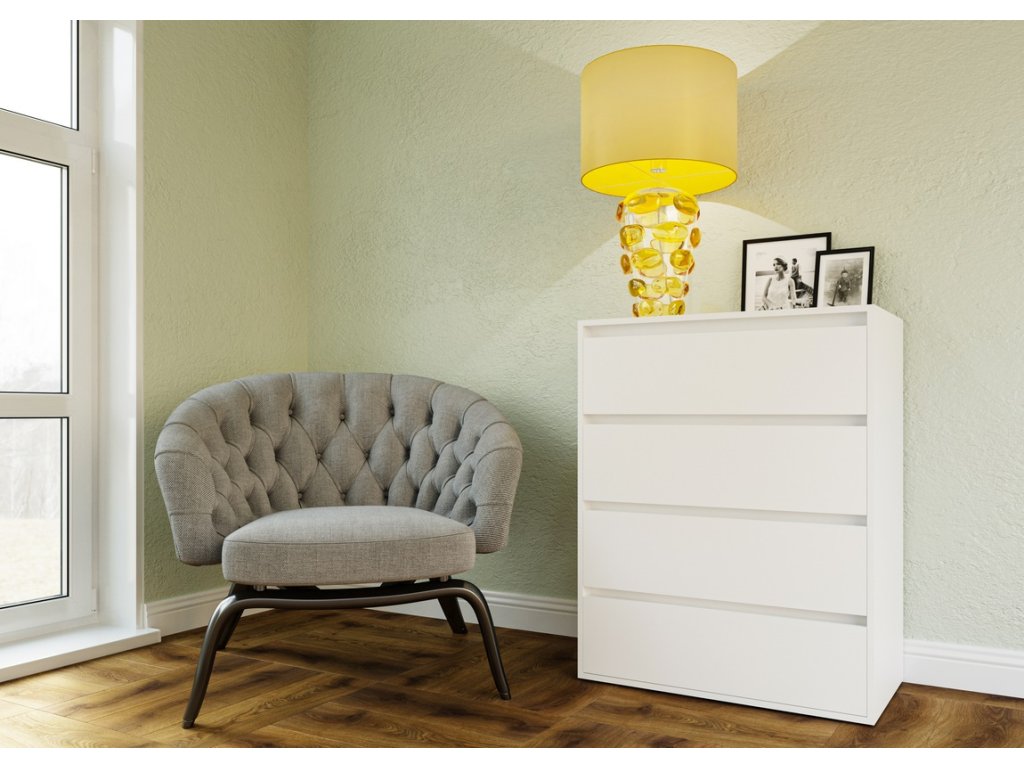 Komoda se čtyřmi zásuvkami je vyrobená z kvalitní laminátové desky v barevném provedení bílá (NImfea alba). Zásuvky jsou bezúchytové. Dodáváme v demontovaném stavu.Doplňkové parametry