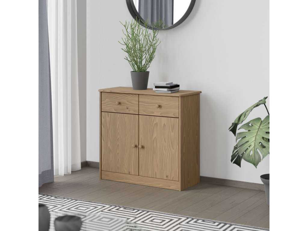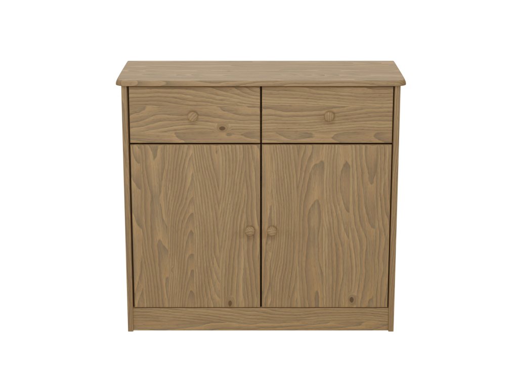 Dvířková komoda, materiál masiv borovice, voskované provedení, 2 zásuvky s kovovými pojezdy, skřínka s dvířky a variabilní policí, hloubka zásuvky 27,5 cm.Doplňkové parametry