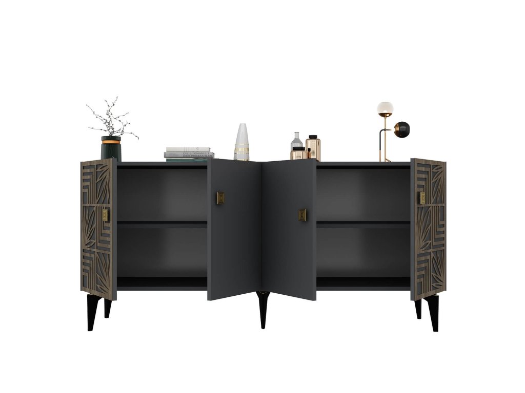 Komoda přináší do vašeho obývacího pokoje kombinaci luxusu a funkčnosti. Její široký design s čtyřmi plnými dvířky nabízí dostatek úložného prostoru pro všechny vaše potřeby, od knih a dekorací až po další předměty, které chcete mít elegantně uspořádané.